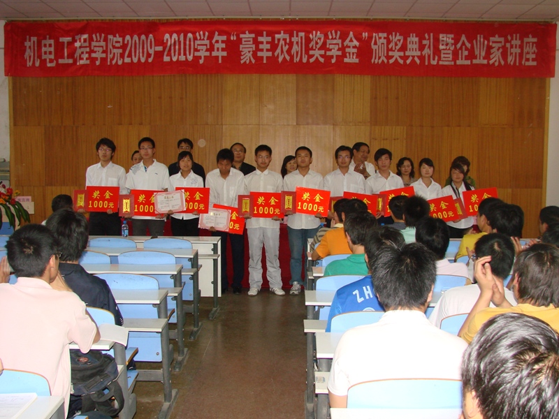 关于颁发2009—2010学年“豪丰农机奖学金”的决定》,对赵楠等十名获奖同学予以表彰。与会领导为获奖同学颁发了证书及奖金。获奖代表薛晓蕾同学在发言中表示一定会珍惜这份荣誉,树立远大理想,继续发奋学习,提高综合素质,争取早日成才,用实际行动报答学校和社会的关心,不辜负党和国家及学校的关怀与期望。