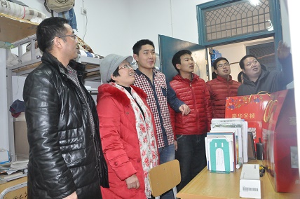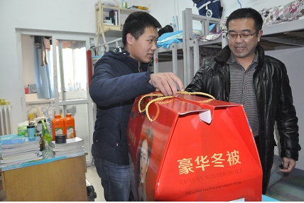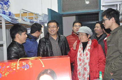 学生5号楼宿舍,341寝室的同学们在看书学习,正在为期末考试做准备,刘书记一行的到来让同学们感到欣喜万分,刘书记对同学们说,最近天气转冷了,你们这些离家百里的学生来到郑州上学不容易,入冬了,学院里给大家送的有过冬的棉被,此外,刘书记还亲切地跟同学们拉家常,询问大家近期的学习怎么样,生活上有没有什么困难等。