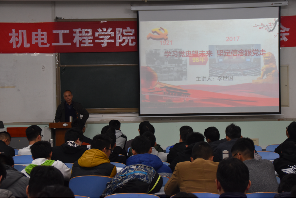 在报告会上,李世国以“学习党史望未来,坚定信念跟党走”为主题,深入地向同学们讲授从中国共产党诞生到党的十九大,党的领导在中国的发展历程中所具有的深远意义。他从“学习党史应该注意的问题”、“党的光辉历史和重要启示”、“迈进新时代”、“大学阶段如何以实际行动跟党走”这四个方面向同学们阐述当代大学生应如何学习党史,坚定信念。他强调政治上要坚定、学习上当标兵、文明诚信为表率、集体活动做骨干、遵规守纪是楷模、社会工作挑重担是对当代优秀大学生的基本要求。