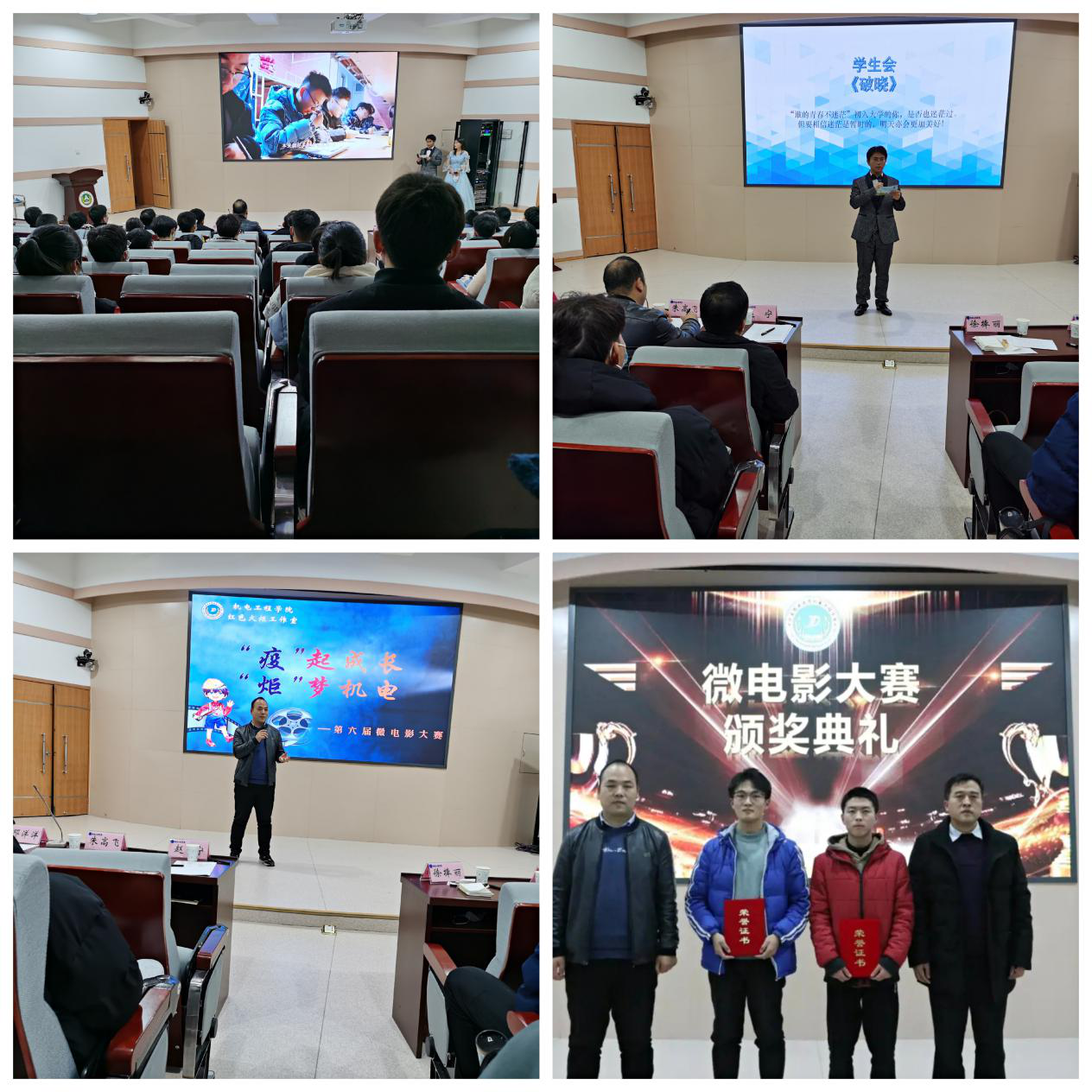 经现场评委打分,农装一班、红色火炬工作室荣获一等奖,交通二班、学生会、机制一班荣获二等奖,团委、能动一班、机制二班、能源一班、电信二班荣获三等奖。赵宁进行活动总结,他指出微电影通过小的视角切入同学们的日常生活,引起同学们内心深处的共鸣,引发大家思考,圆了同学们导演梦、编剧梦、演员梦。微电影大赛是非常好的平台,愿各位同学再接再厉,争取每一届都有新的提高。最后,赵宁希望同学们通过微电影传递思考,传递感动,进而转化成努力学习及好好生活的动力,未来可期。