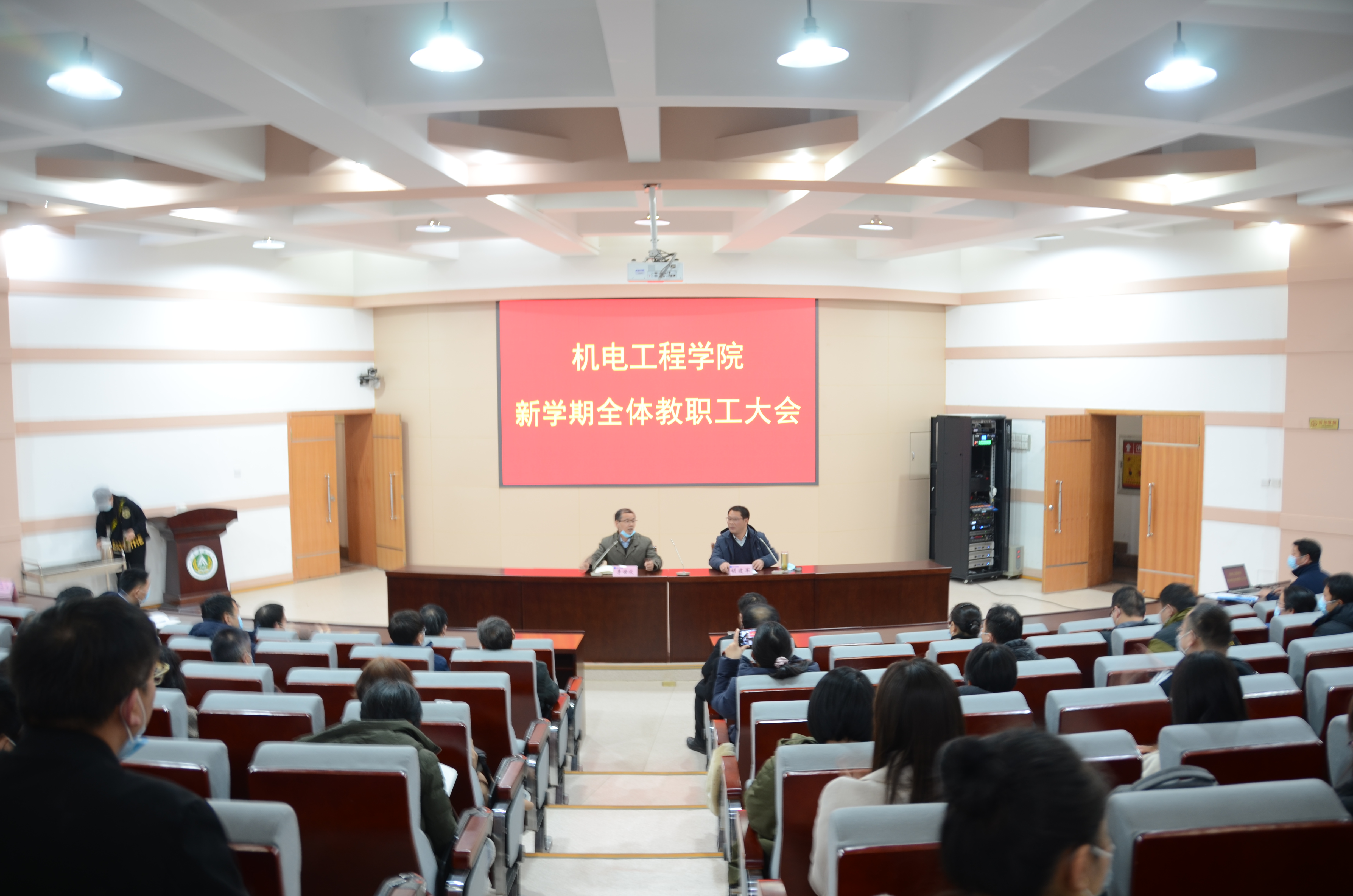 在校礼堂300人报告厅召开全体教职工大会,传达学校有关会议精神和工作要求,部署学院新学期各项工作。会议由院党委书记李世欣主持。
