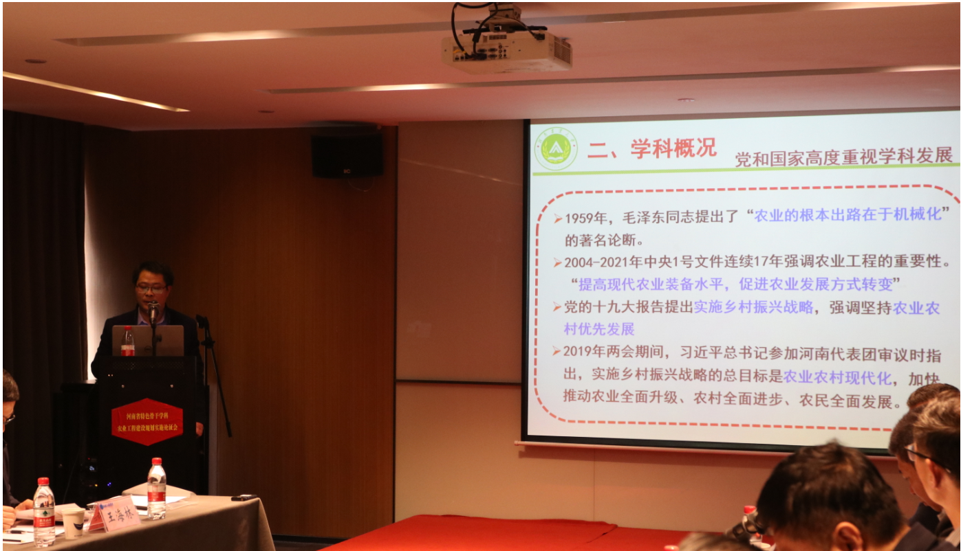 最后,农业工程学科带头人张全国教授做了表态发言。他充分肯定了各位领导和专家提出的建设性意见,并明确了学科下一步发展思路。他指出,学科未来发展要立足生态农业的时代背景,根据碳中和、碳达峰要求,结合河南地方经济建设需求,突显出大田农业装备需求和服务特色,做出学科更大的贡献、培育出学科更大的成果;新发展阶段要进一步扩大国际视野,加强国际专著、国际专利等撰写和申请;加大国际化师资队伍构建和研究生国际联合培养的力度;农业工程学科应助力育种、栽培等传统专业,加强信息化技术在农业生产和农产品供给中的应用,促进学科交叉融合发展;强化农业工程技术在农业农村现代化建设中的应用水平,整体提升学科服务社会能力,助推乡村振兴。(图/文 肖鑫瑞、李德峰)
