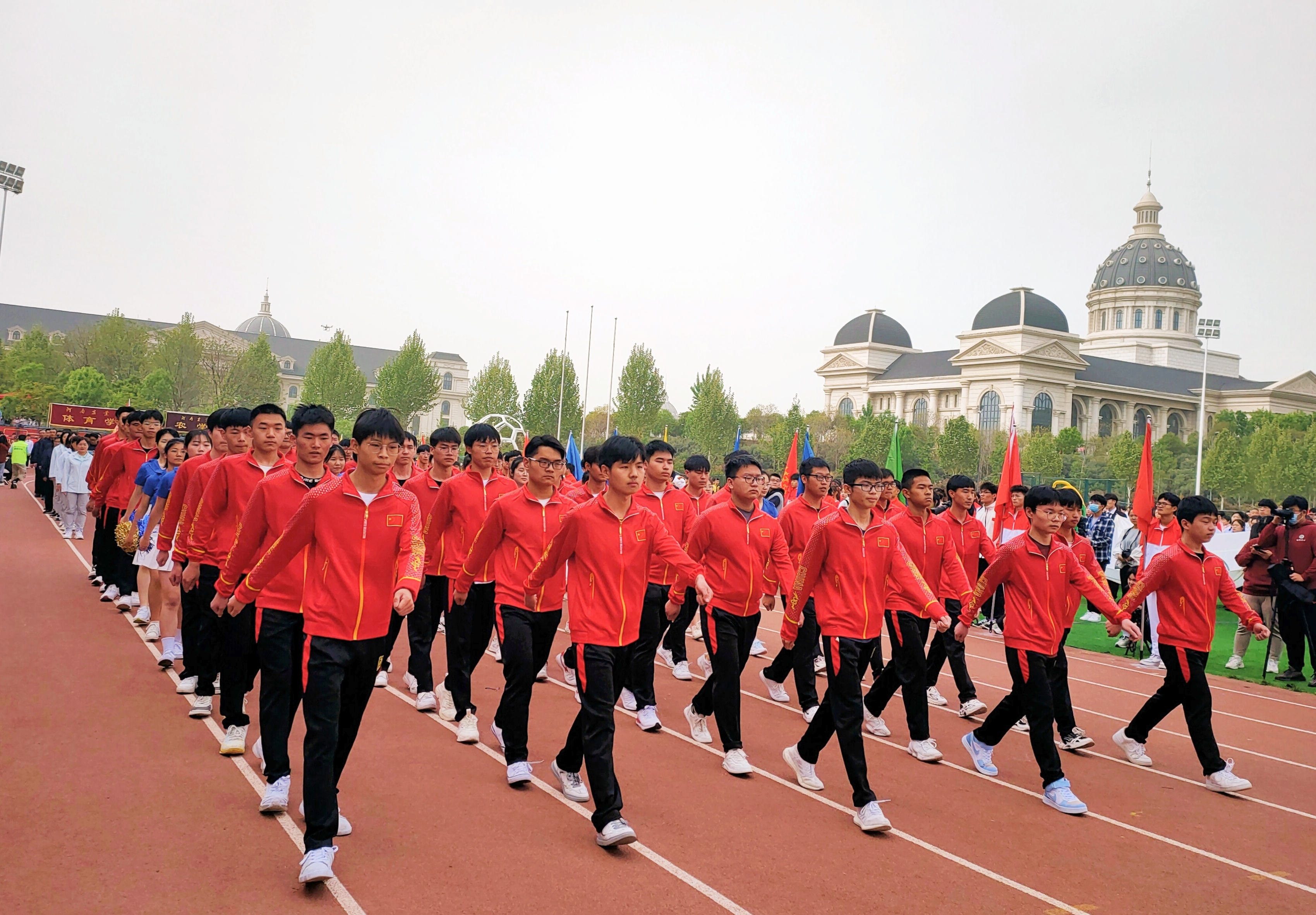 彩旗队迈着欢快的步伐,跳着青春的舞蹈,运动健儿们迈着铿锵步伐、昂首挺胸、自信满满,教师们坚定目光、气宇轩昂、英姿飒爽,他们展现出青年特有的朝气与活力。