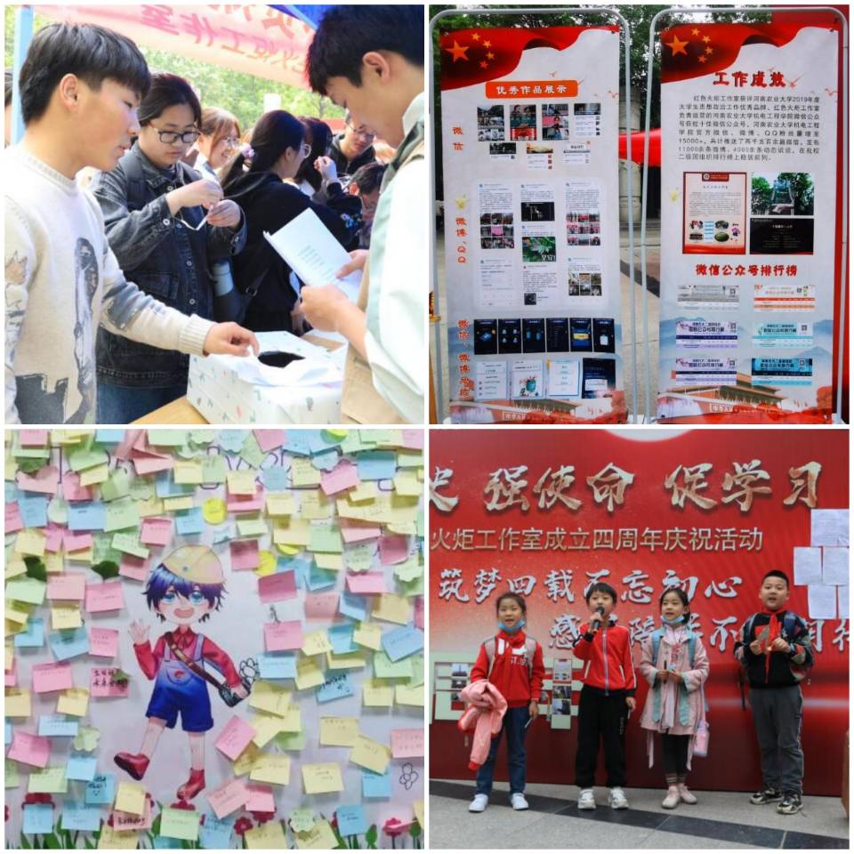 活动通过红色电影展板、英雄人物事迹展板和红色征文展示,带领学生缅怀英雄人物,重温历史脉络。活动现场同学们热情高涨,于党史问答中,重拾革命历史文化,学习党史知识;在诗词接龙中,品味红色经典,传承革命思想;通过颂唱红色歌曲唱响历史辉煌,体悟红色精神。同学们还通过多个互动环节重新学习了党的相关知识,并在“2021.4.25,小火四岁了”展板上手写寄语、画小红花来传达他们对工作室由衷的祝福和支持。现场还吸引了许多小朋友前来参加,从他们洋洋盈耳的歌声中感受到他们对祖国的纯质热爱。此外,红色火炬成员们通过易拉宝展示成立以来举办的活动和工作上取得的成果。