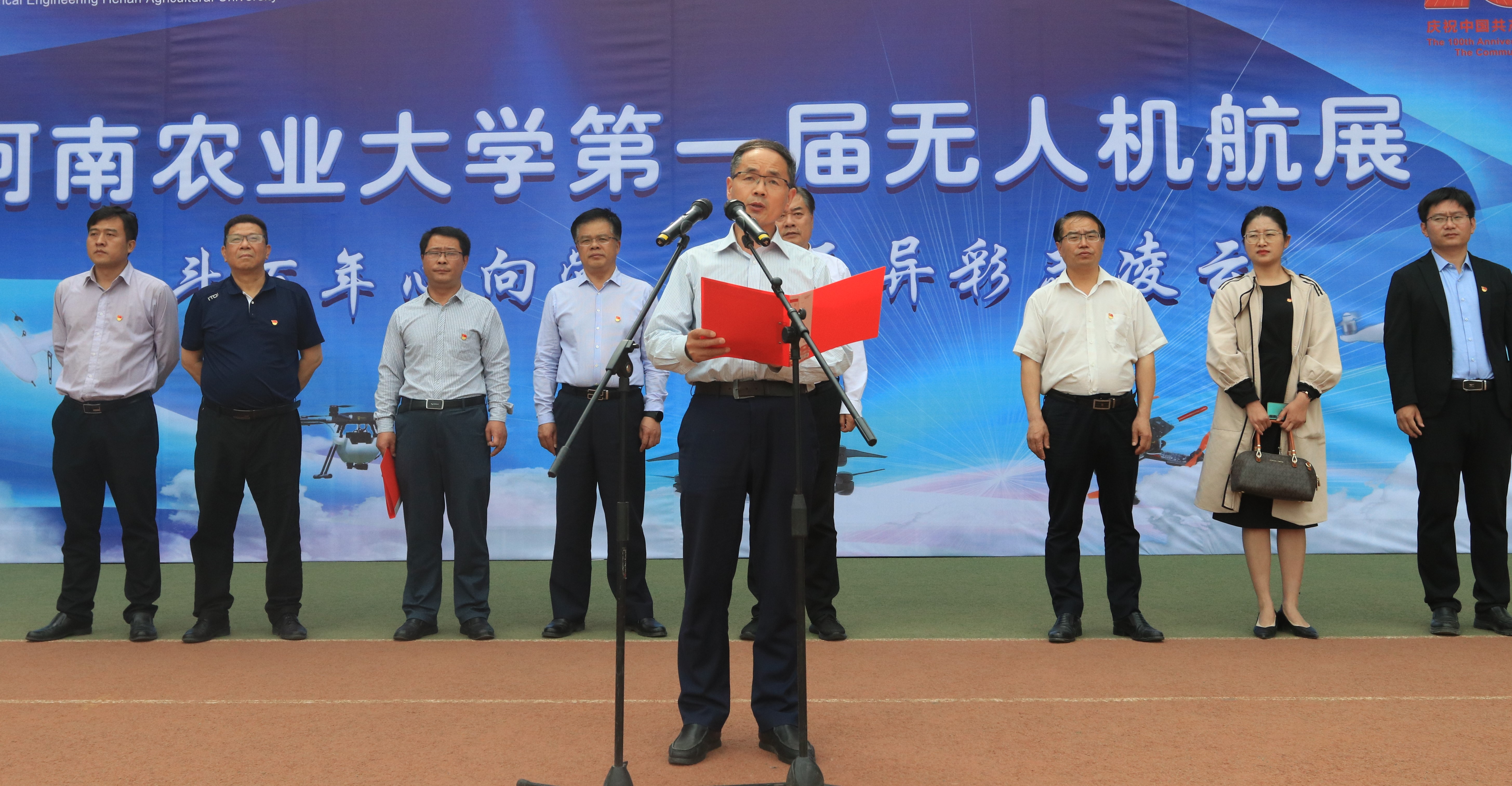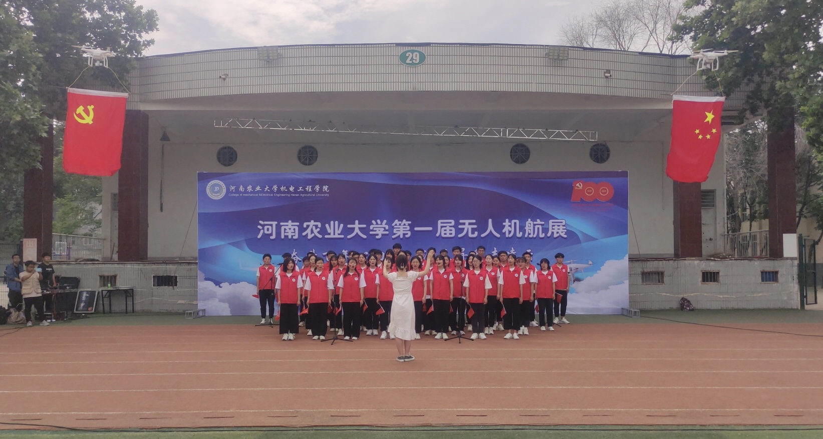 青年学子悠扬的歌声,将农大人最清澈的爱献给党。乐声渐低,一架架无人机缓缓启动,本次活动的重磅环节——无人机表演隆重上演,此起彼伏的旋转腾空、一系列难以置信的空中机械动作、行云流水的喷洒播种......精彩绝伦的表演吸引着现场全体师生,场边生动形象的解说、喝彩连连的助威,更增添了活动的观赏性和娱乐性。