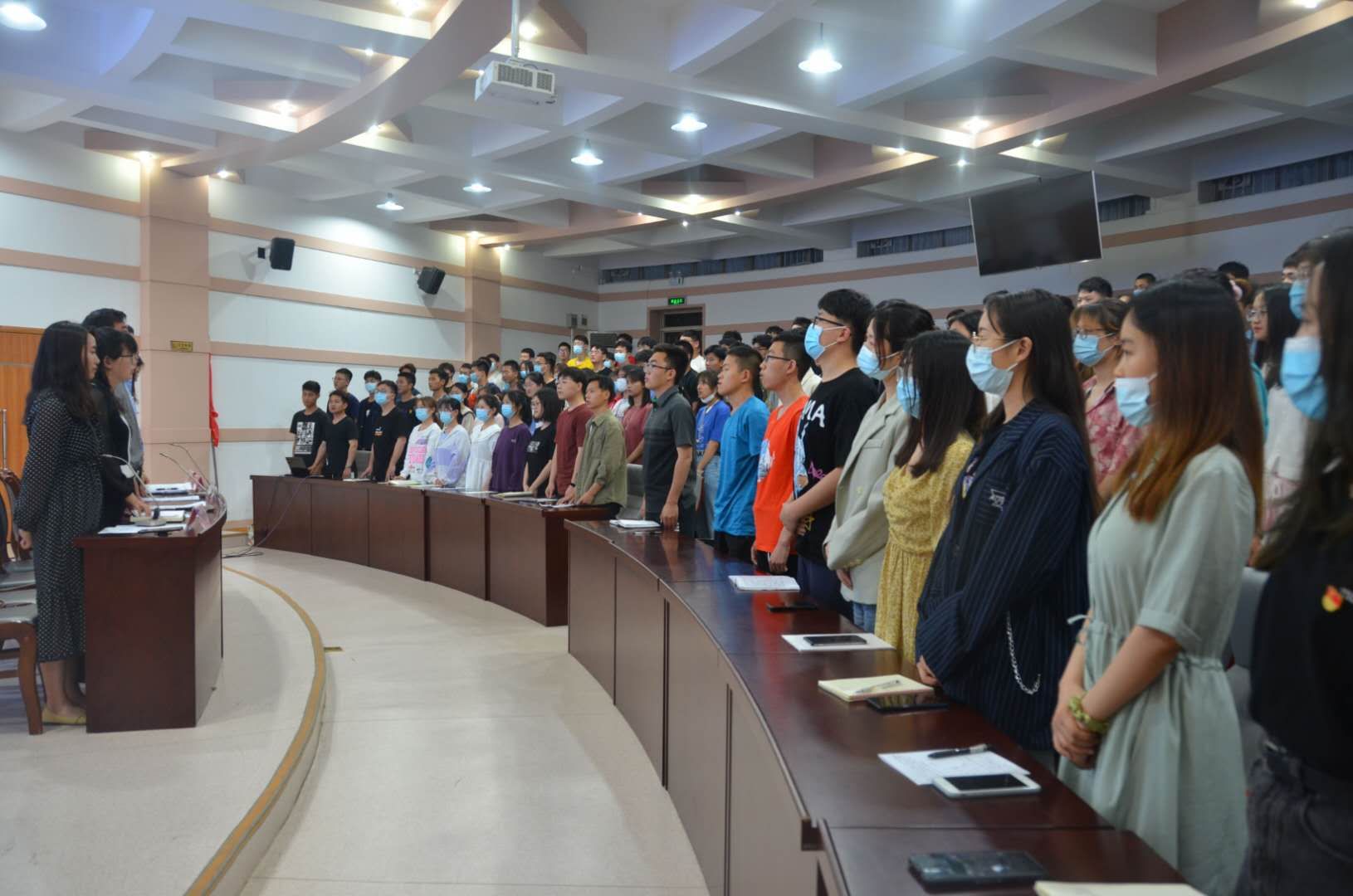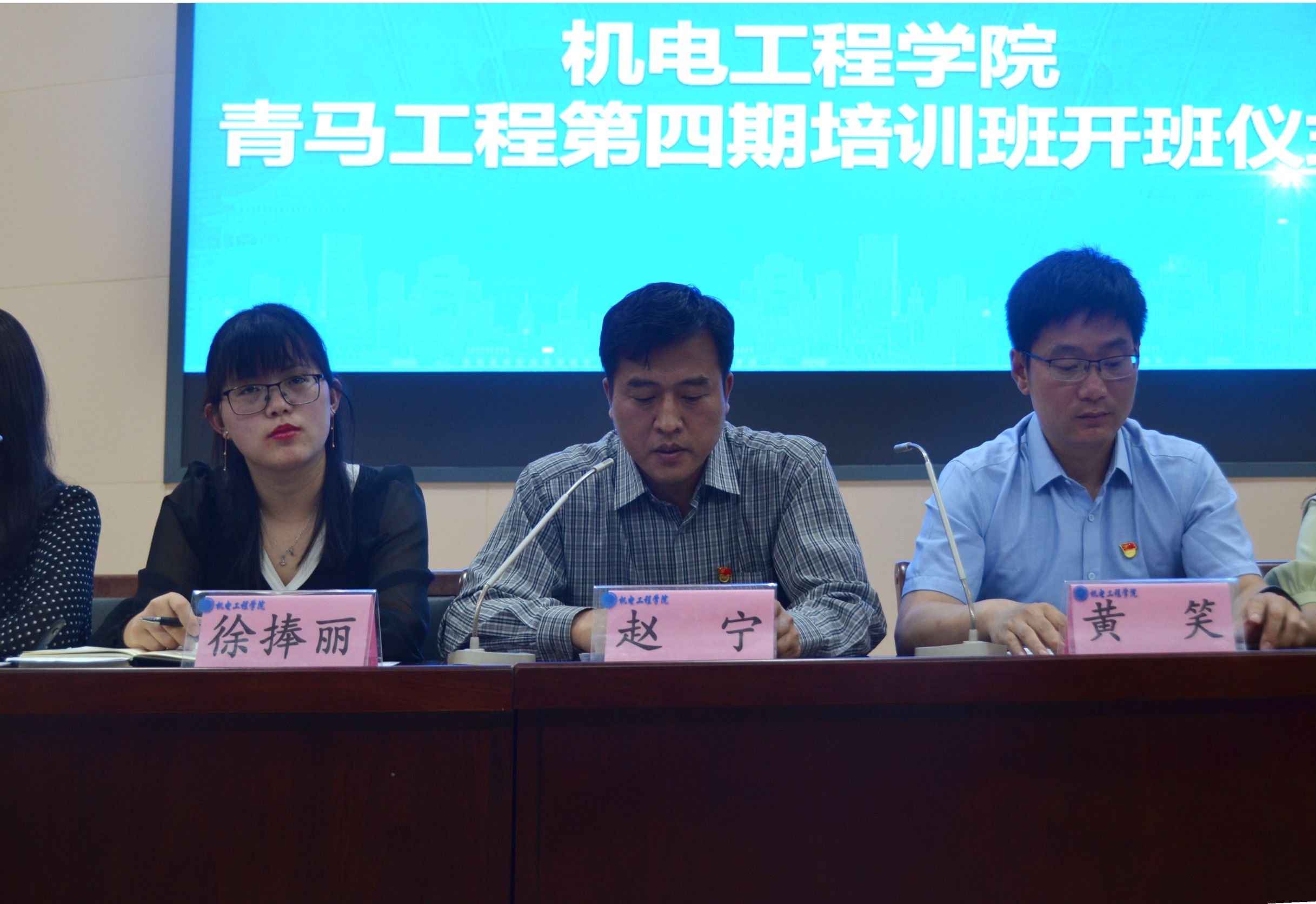 于文化路校区三百人报告厅举行“青马工程”第四期开班仪式。党委副书记赵宁、院团委书记黄笑、院团委副书记徐捧丽、辅导员胡亭亭、王晓楠、徐佳亮出席,青马班成员、四大组织学生代表、社团代表、运动员代表参加会议。会议由院辅导员王晓楠主持。