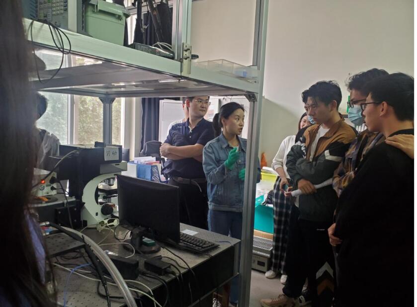 随后同学们来到河南省农业激光技术国际联合实验室,商俊娟老师、博士生张燕燕和硕士生胡一帆、李冬贤、苏睿、李灿、位文涛、李保磊等分别介绍和演示了“表面等离子共振生物传感器”、“激光诱导击穿光谱技术”,“激光表面增强拉曼光谱技术”和“农业面源氮磷污染检测技术及仪器”等实验。