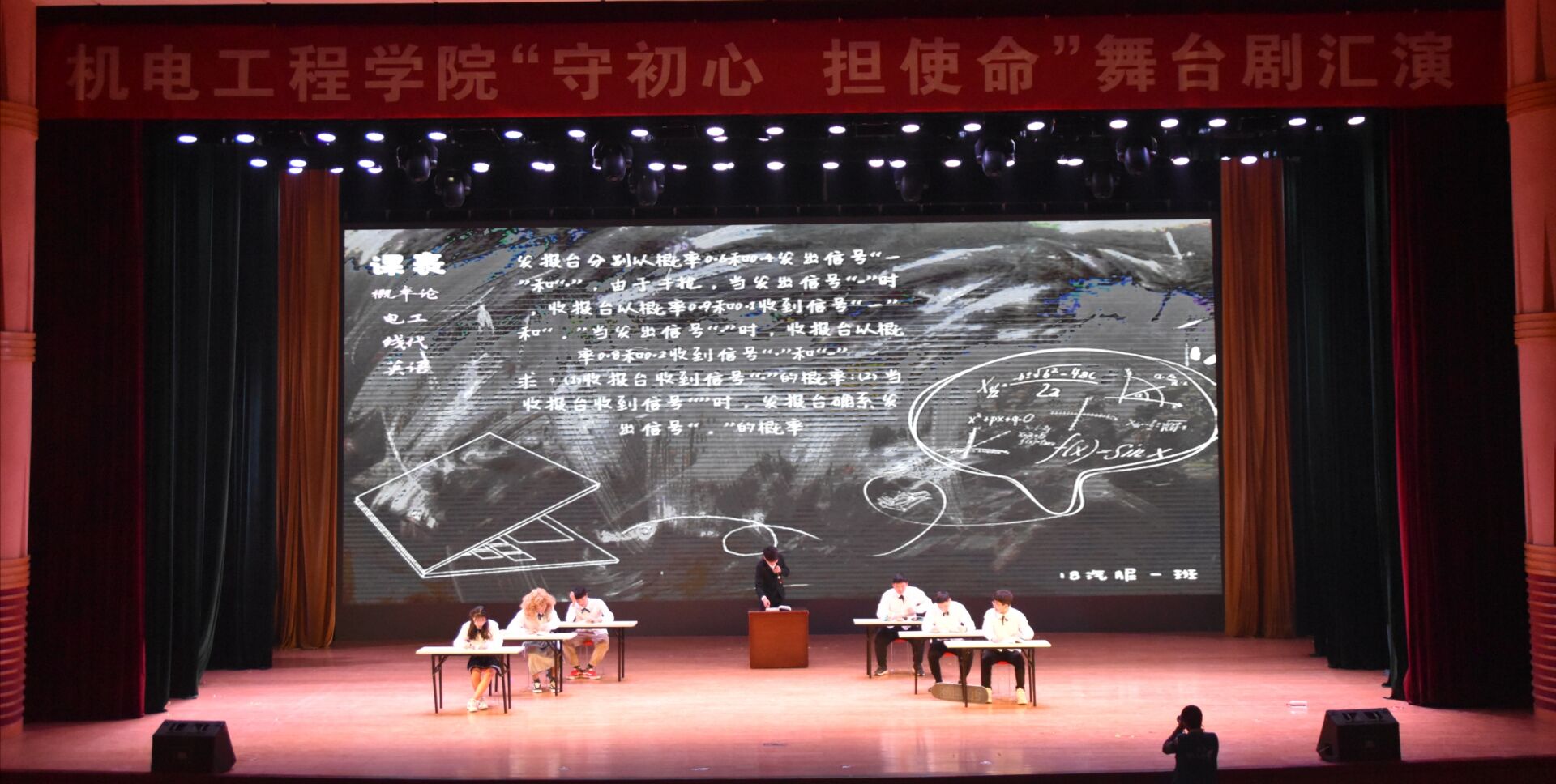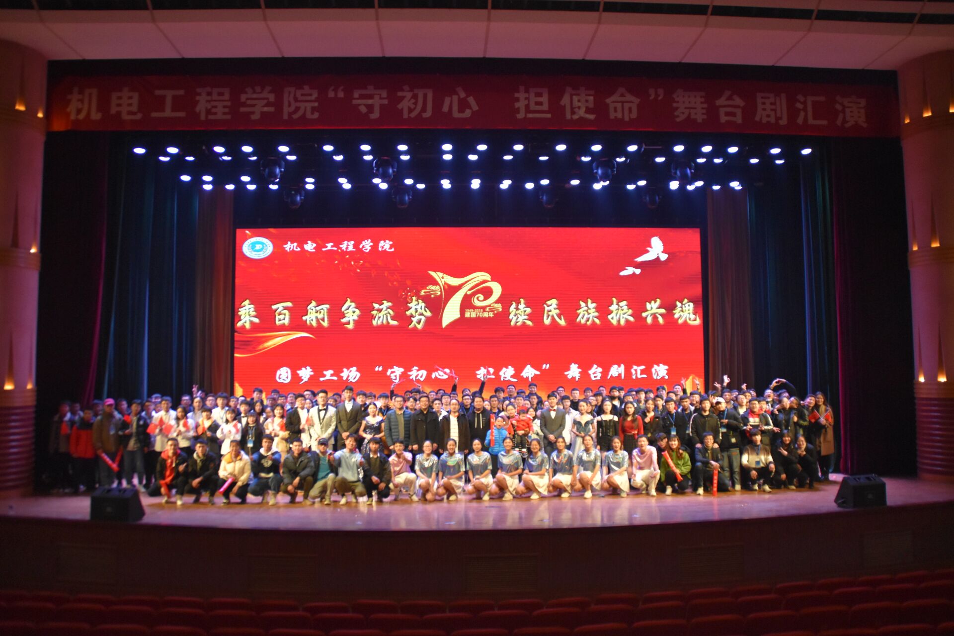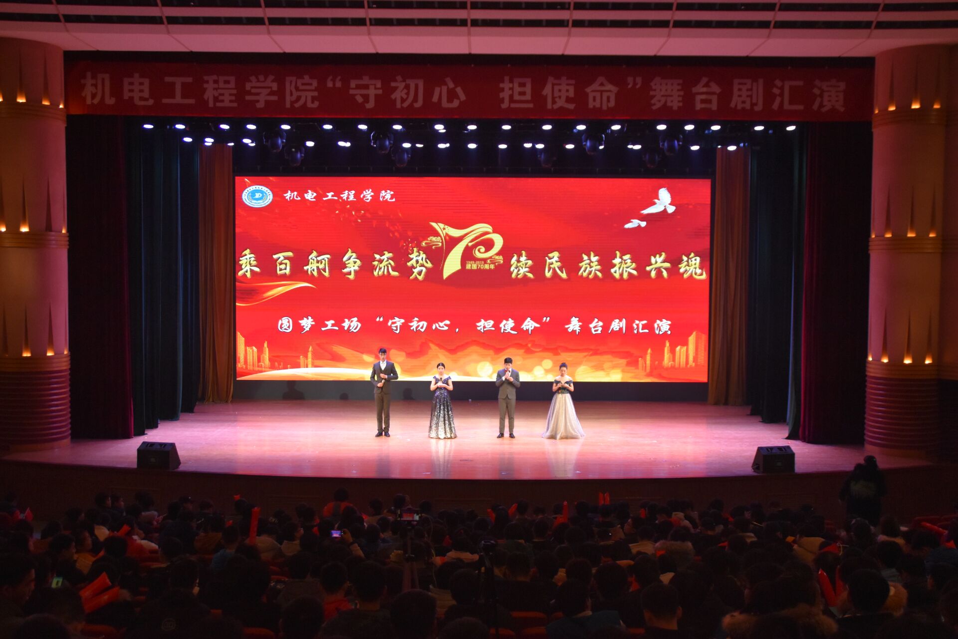 以追溯党史,重温校史,唤醒初心,担当成长为主旨,在大礼堂隆重举办“守初心 担使命”舞台剧汇演暨元旦晚会,院党委书记李世欣、党委副书记刘海涛、学院老师和18、19级本科生观看了此次演出。晚会分为“不忘初心 颂歌华诞”、“牢记使命 百舸争流”和“勇于担当 机电远航”三个篇章,集舞台剧、舞蹈串烧、相声小品、歌曲、朗诵等多种表演形式为一体,为广大师生带来了一场视听盛宴。