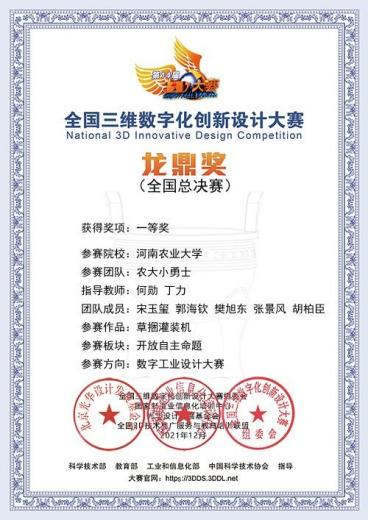 何勋、丁力老师指导的“农大小勇士”团队(研究生队员:宋玉玺、郭海钦、樊旭东、张景风、胡柏臣)凭借作品《草捆灌装机》取得大赛(数字工业方向)一等奖,由色情小说网