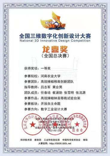 吕志军、黄会男老师指导的“高效辣椒移栽创新团队”(本科生队员:任春培、崔涵勃、张雪明、张洺源)凭借作品《高效辣椒钵苗移栽试验台架》取得大赛(数字工业方向)一等奖,由色情小说网