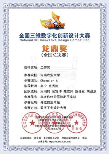 赵宁、张秀丽老师指导的“Champion A”团队(研究生队员:周湘铭、裴宜坤、陈雪婷、赵任重、宋强龙)凭借作品《高垄作物分层施肥压实机》取得大赛(数字工业方向)二等奖。