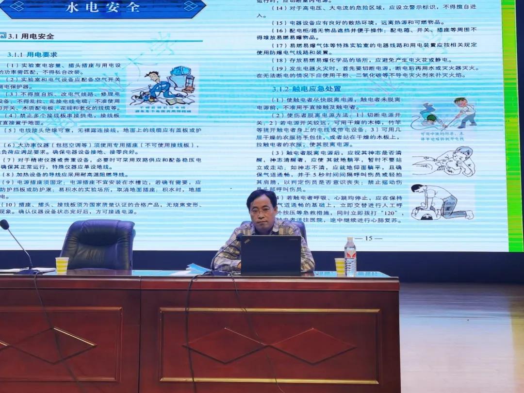 实验室安全手册做出具体说明,向同学们详细介绍了有关实验室安全及电气火灾的预防知识。随后,他采用视频加事例的形式,向同学们清晰地展示了由于电气不安全所引发的各种事故以及做好安全措施的必要性,同时建议新生在日常生活中要时刻注意电器使用安全问题,养成良好用电习惯,避免造成不可逆的损失。