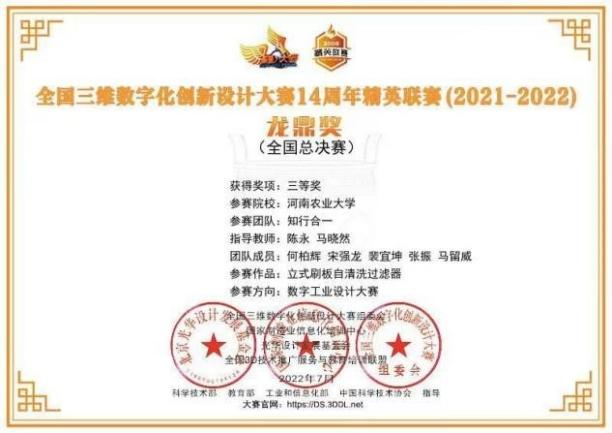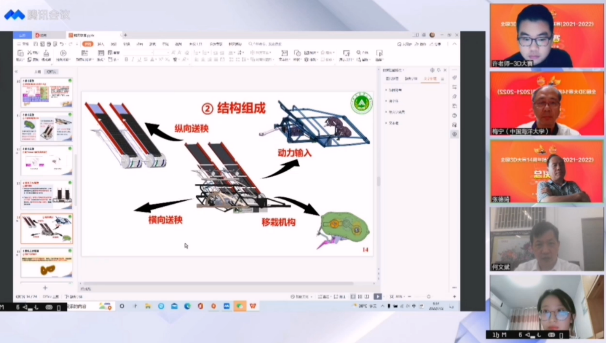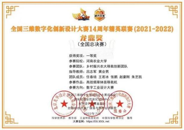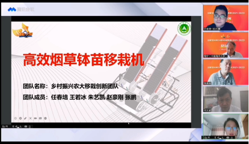 结合疫情防控要求,本届全国总决赛采用线上为主的方式进行,经过省赛层层选拔,本次年度总决赛超过400个团队参与角逐国赛龙鼎大奖,为保证大赛公平、公正、有序进行,总决赛所有参赛团队的竞赛顺序均以网络抽签决定。其中,由色情小说网 吕志军、黄会男老师指导,任春培、王若冰、赵豪刚、张鹏、朱艺凯等本科生组建的“乡村振兴农大移栽创新团队”凭借《高效烟草钵苗移栽机》作品取得国赛一等奖;由陈永、马晓然老师指导,何柏辉、宋强龙、裴宜坤、张振、马留威研究生组建的“知行合一团队”凭借《立式刷板自清洗过滤器》作品取得国赛三等奖。