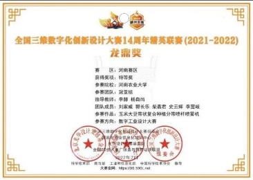 师生获省特等奖3项的好成绩。由吕志军、黄会男老师指导,任春培、王若冰、赵豪刚、张鹏、朱艺凯本科生组建的“乡村振兴农大移栽创新团队”凭借《高效烟草钵苗移栽机》作品取得省赛特等奖,由陈永、马晓然老师指导,何柏辉、宋强龙、裴宜坤、张振、马留威研究生组建的“知行合一团队”凭借《立式刷板自清洗过滤器》作品取得省赛特等奖,由李赫、杨自尚老师指导,刘家威、郭长乐、柴嘉君、史云辉、李昱岐研究生组建的“冠亚组团队”凭借《玉米大豆带状复合种植分带喷杆喷雾剂》作品取得省赛特等奖。
