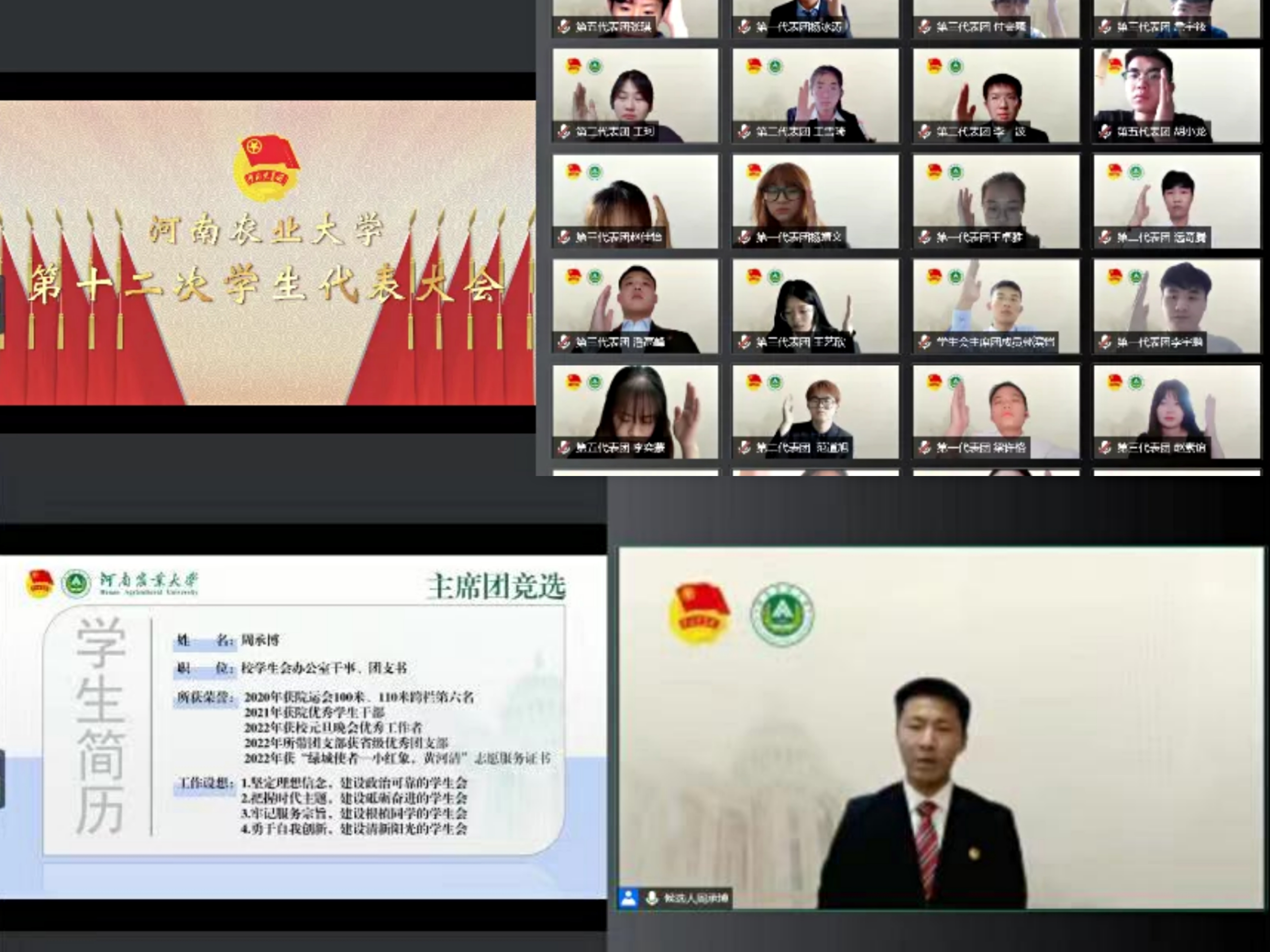 上一届学生会主席团成员郭滨恺代表校学生会做述职报告。他首先对一直以来指导和关心学生会的各位领导老师,积极配合学生会工作的同学们以及学生会全体成员表示感谢,随后围绕校学生会一年来各项工作的开展情况进行述职总结。最后,他对新一届学生会成员提出殷切期望,希望新一届学生会成员能够牢记服务同学的宗旨和使命,在新的历史征程中团结带领广大同学为我校建成中国特色世界一流农业大学贡献青春力量。