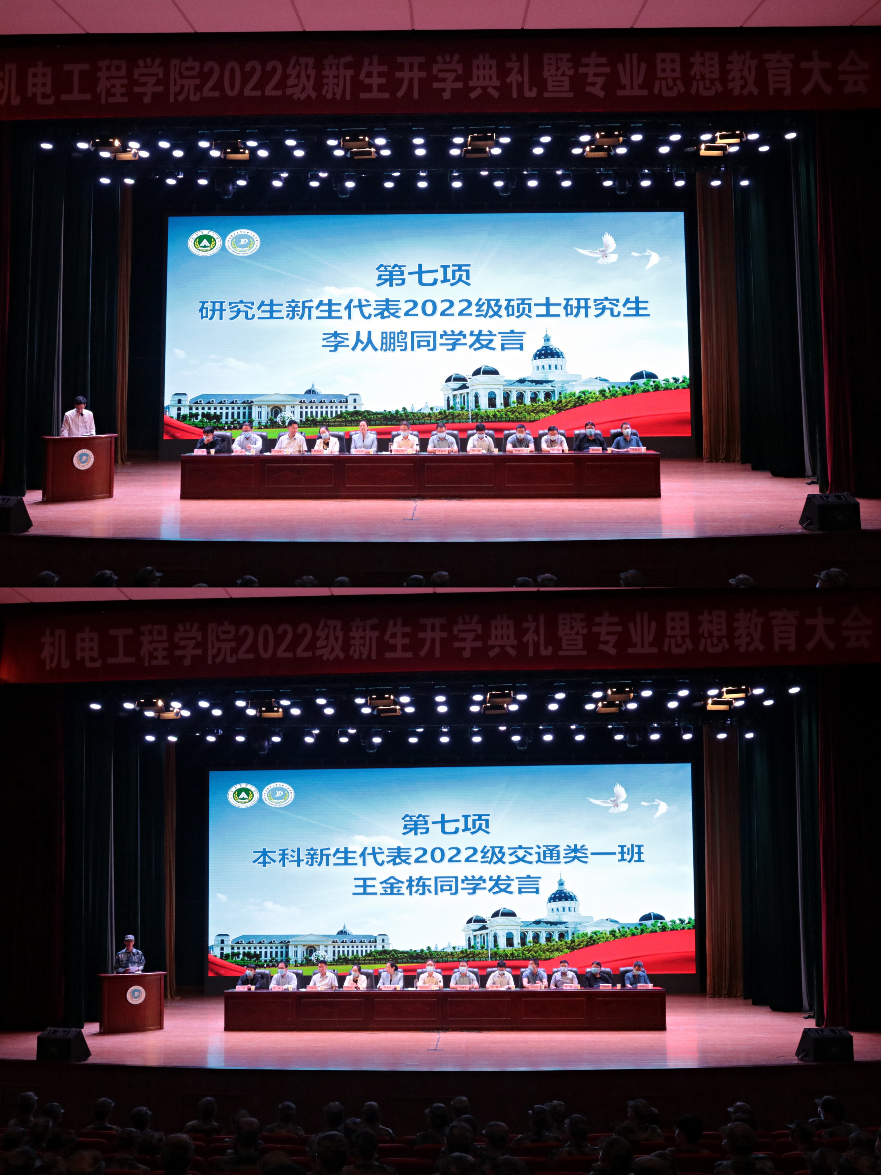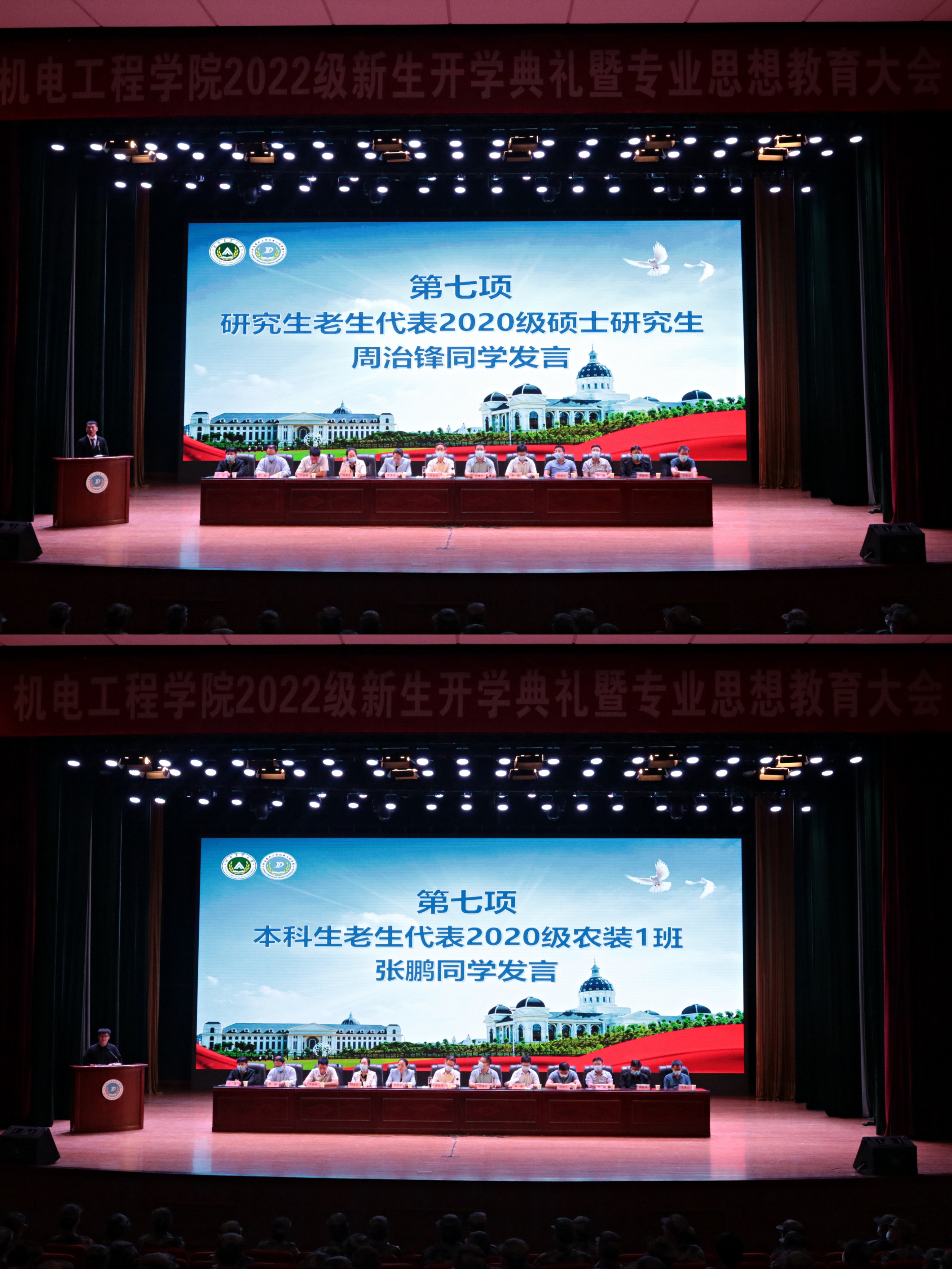 2020级研究生老生代表周治锋、本科生老生代表张鹏分别上台发言,他们以自身大学生活的经历为依托,向各位新生分享自己的学习与生活经验,希望大家能够在全新的征程中做好自己的人生规划,不负青春、重新启航,在广阔的天地里尽情施展自身才华,在机电这个大家庭里书写人生中最美的青春篇章。