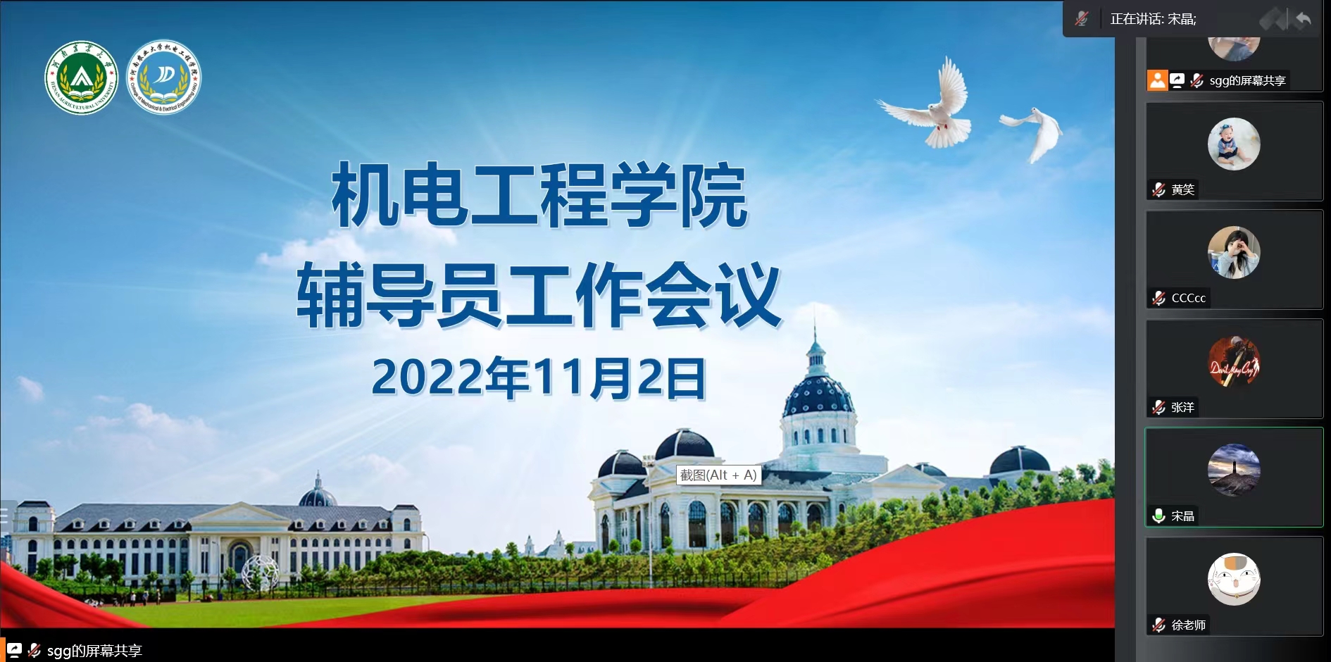 召开辅导员疫情防控线上工作会议,院党委副书记宋晶,团委书记黄笑,团委副书记徐捧丽出席会议,各年级辅导员及兼职辅导员参加会议。