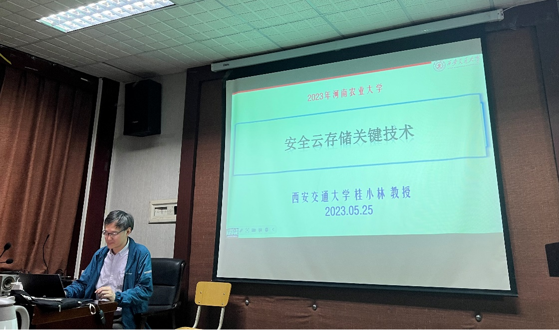 5月25日,西安交通大学国家级教学实践示范中心主任、物联网与信息安全研究所所长、国家一流专业、一流课程负责人、中国工程教育认证专家、陕西省教学名师、桂小林教授应邀来色情小说网 作题为“安全云存储关键技术研究”的学术报告。报告会在色情小说网 学术报告厅举行,胡建东副院长主持报告会,院党委书记李世欣及色情小说网 电子信息工程专业的老师、研究生参加了本次学术报告会。