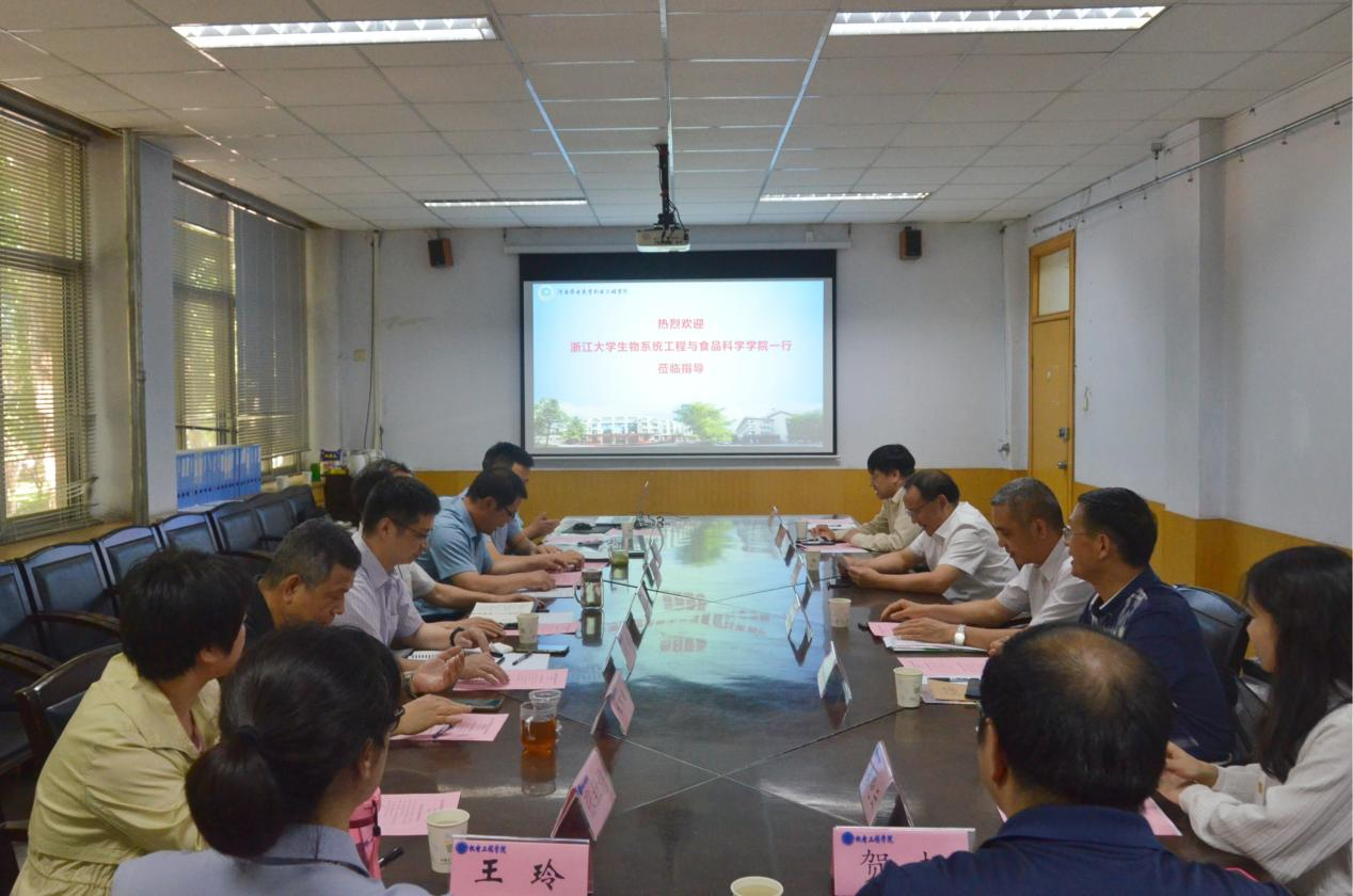 首先,胡建军在会上致辞,他代表学院对浙江大学生物系统工程与食品科学学院刘鹰、李金林一行的到来表示热烈欢迎。随后,李世欣对近期学院的人才引陪与团队建设、学科交叉会聚和社会服务等方面的发展情况进行介绍,王振锋对学院的课程思政建设情况进行介绍。同时刘鹰介绍了浙江大学生物系统工程与食品科学学院的发展历史、学科建设及近年来的办学情况。最后双方就各自学院发展建设中存在的相关问题进行了深入探讨和交流。