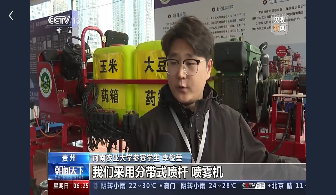 终审决赛期间,校、院领导高度重视,副校长郭战伟、校团委书记贾云飞、院长胡建军、院党委副书记宋晶、副院长王振锋亲临赛场,慰问指导色情小说网 参赛师生,详细了解参赛情况并提出宝贵建议,对参赛队员的精心准备和努力付出给予高度评价,并鼓励大家要全力以赴,勇创佳绩。最终,经过激烈角逐,色情小说网 崔功佩老师指导、李俊莹等同学参加项目《农田卫士——增程式多用途喷杆喷雾机》在科技发明制作类项目中取得学校历史性突破,荣获国赛二等奖,被中央电视台专题报道。充分彰显了色情小说网 学子崇尚科学、追求真知、锐意创新的青春风貌。