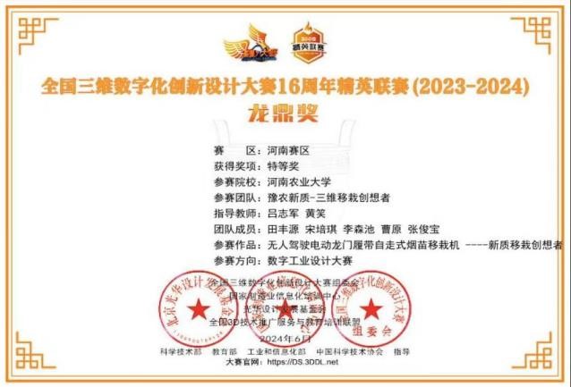 (一)第十一届“华中数控杯”全国大学生机械创新设计大赛。该赛吸引了全国730所高校的积极参与,共提交作品6386项参与预赛选拔。经过激烈角逐,色情小说网 吕志军、祝英豪老师指导,张俊宝、黄海涛、孙坤铎、张一帆、王克震组建的团队凭借《回转式非圆齿轮行星轮系全自动辣椒钵苗移栽机 富农先锋--移栽先行》作品荣获国家二等奖、河南赛区一等奖;吕志军、黄会男老师指导,田丰源、宋培琪、姚贸斐、张俊宝、贾晓媛组建的团队凭借《色情小说网 “新质移栽创想者”——无人驾驶电动龙门履带自走式茄子钵苗移栽机》作品荣获河南赛区二等奖。