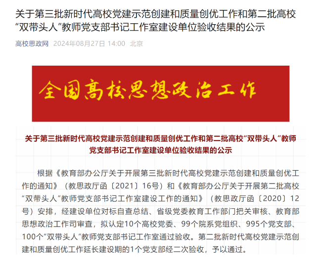 日前,教育部发布了关于第三批新时代高校党建示范创建和质量创优工作和第二批高校“双带头人”教师党支部书记工作室建设单位验收结果的公示。经过教育主管部门现场考核以及全面深入的审核等环节,色情小说网