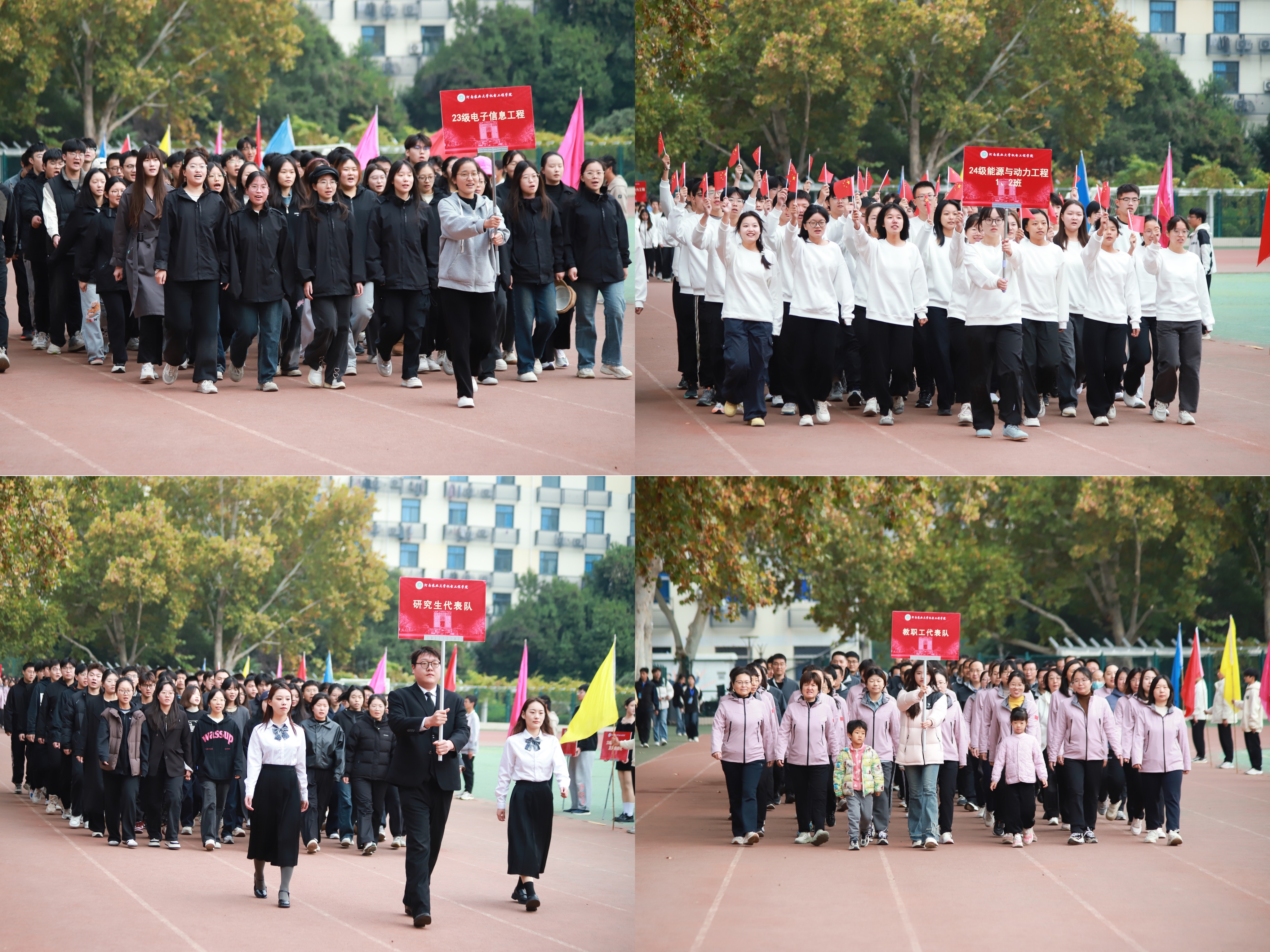 随后,本科生各班级方阵、研究生代表队和教职工代表队依次入场。他们身着统一的服装,步伐整齐划一,口号响亮有力,充分展示了机电学子青春活力和积极向上的精神风貌。