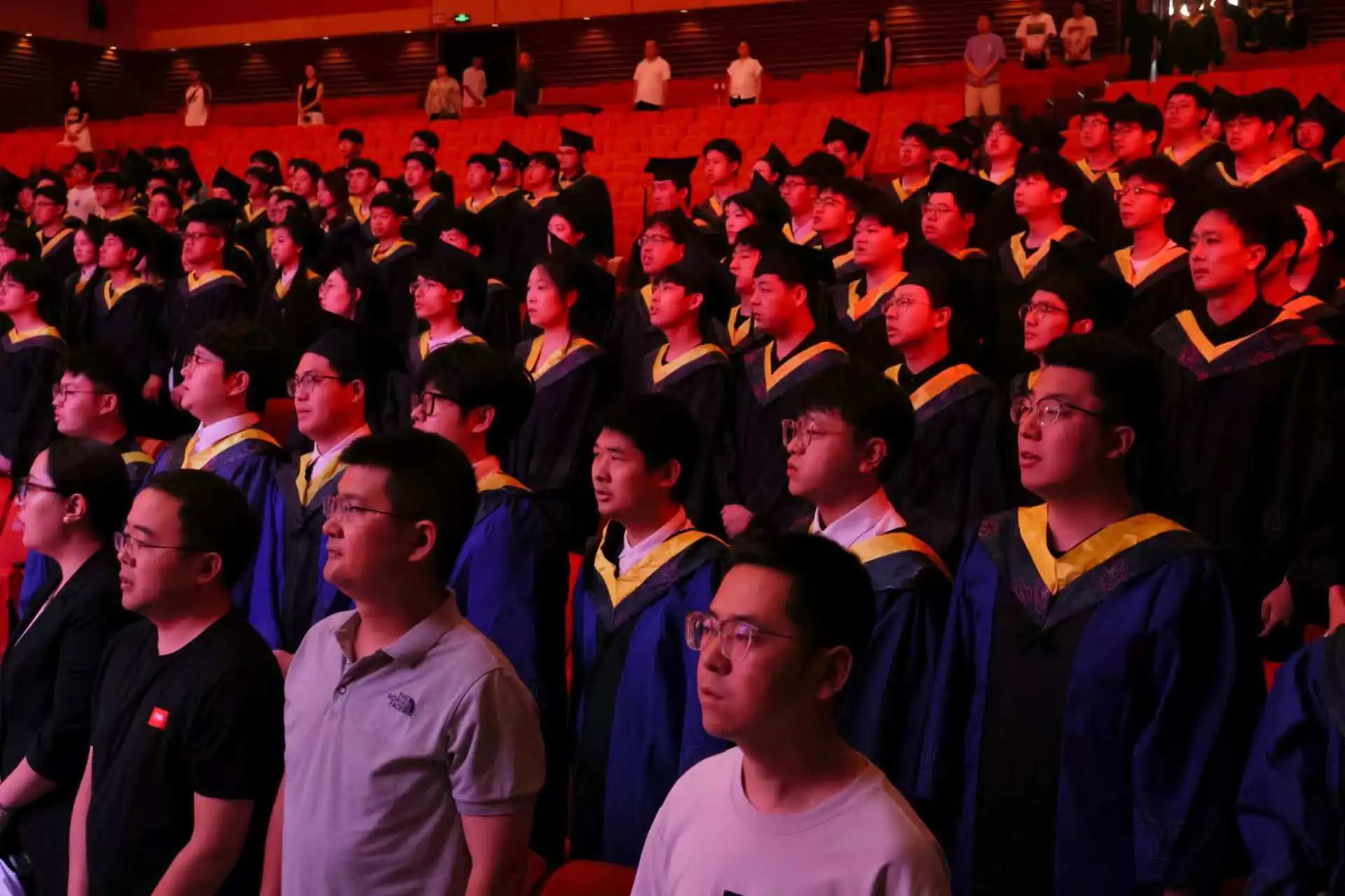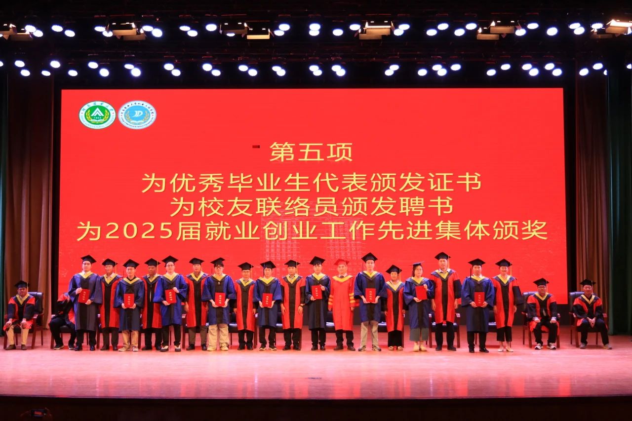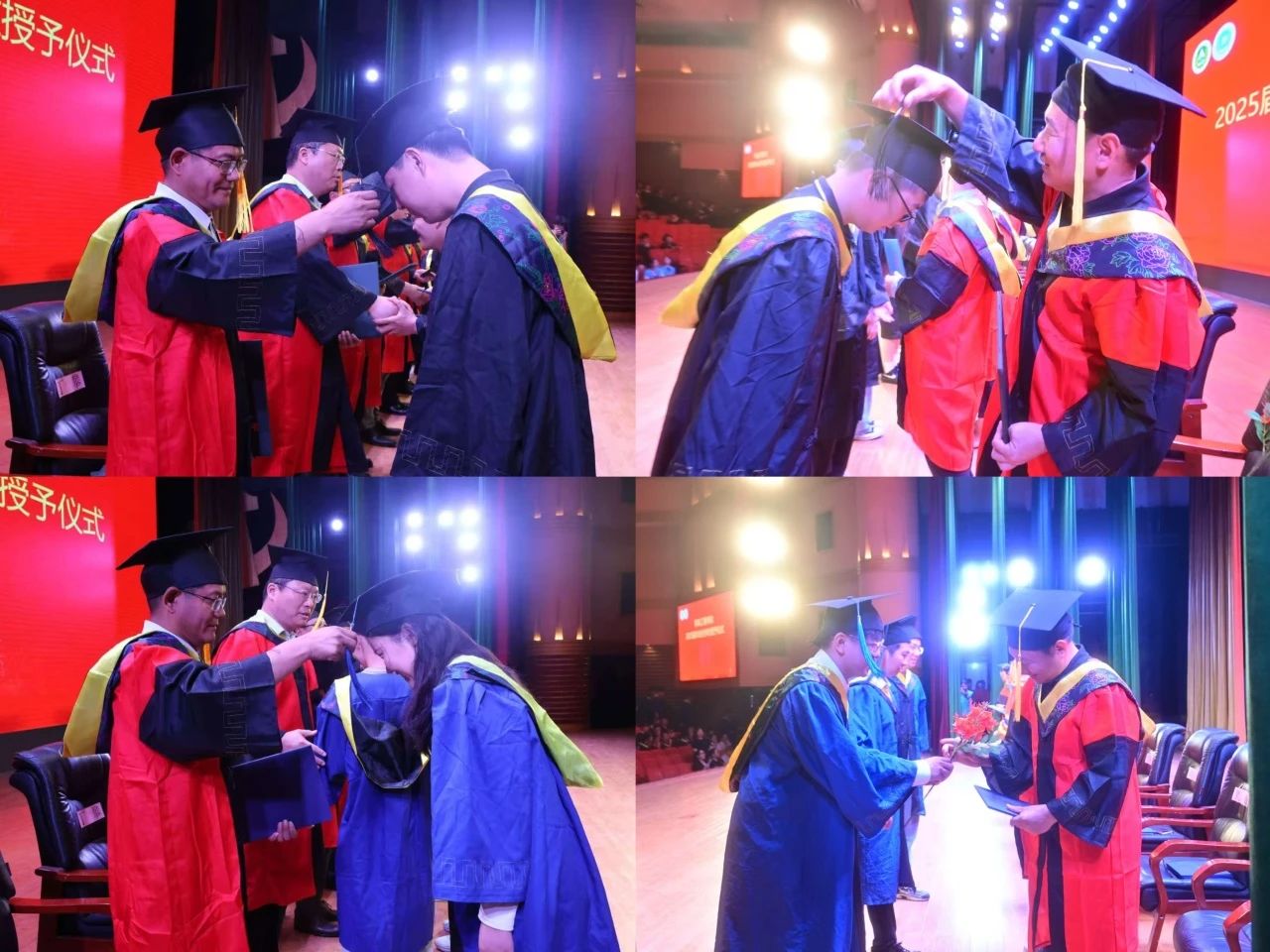 毕业生依次上台,各位领导和老师为他们整理学士帽、颁发毕业证书,共同留下珍贵的毕业合影。
