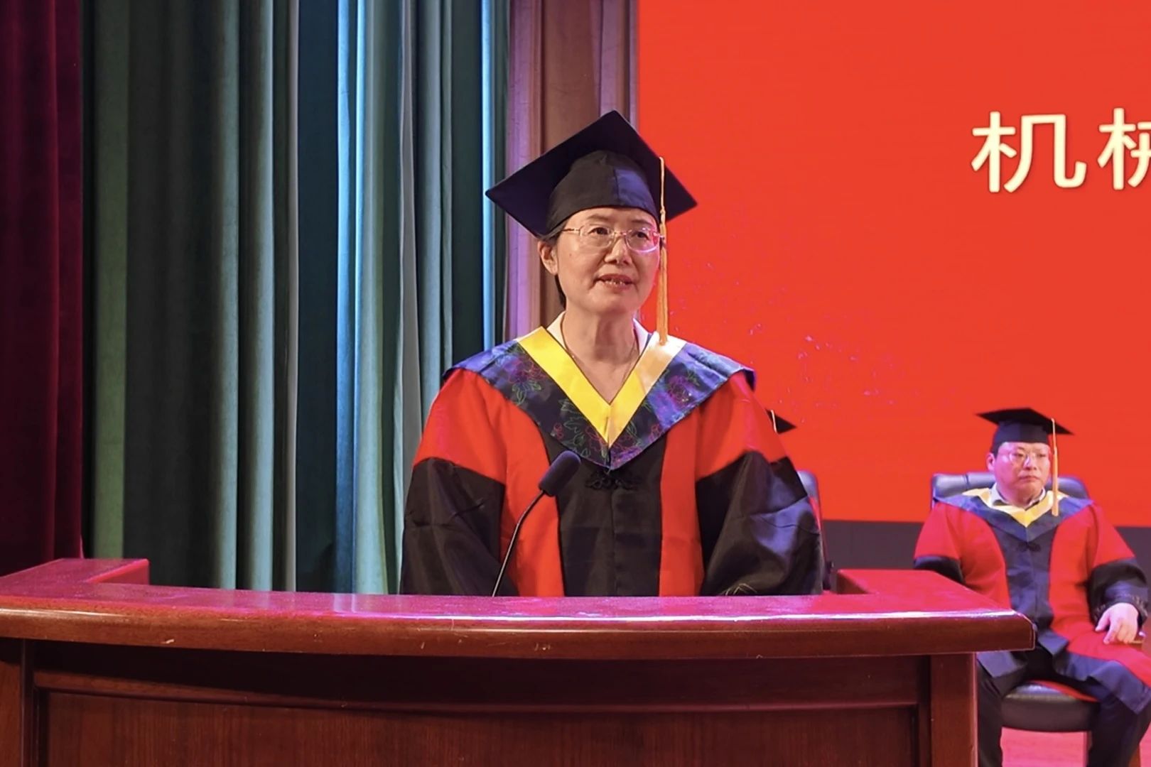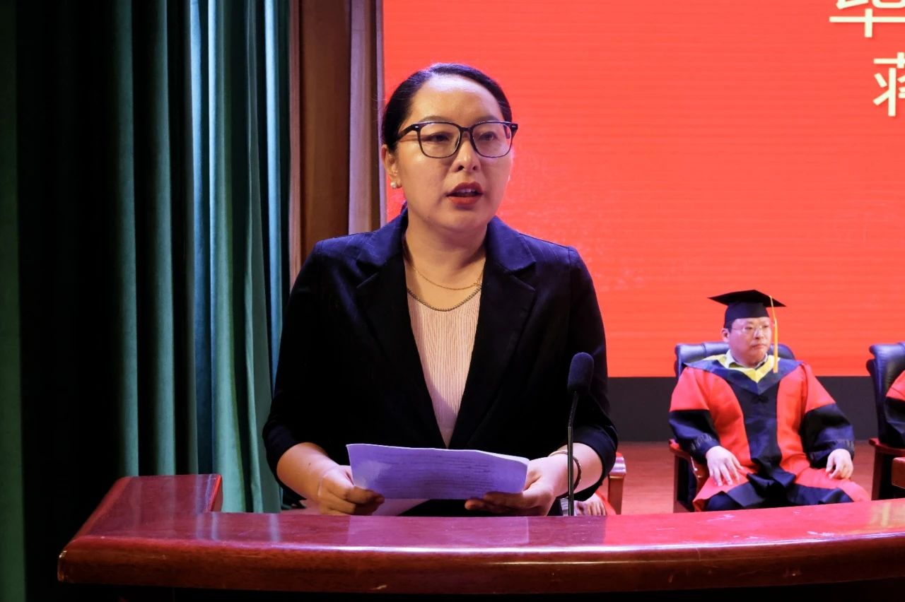 教师代表袁志华教授进行发言,她向2025届毕业生致以祝贺,感慨于他们完成学业即将奔赴新岗位。同时,对毕业生提出两点期望:一是心存敬畏真理、责任与生命,守护精神底线;二是铭记身份转变,以所学回报社会,在新征程中勇担使命。