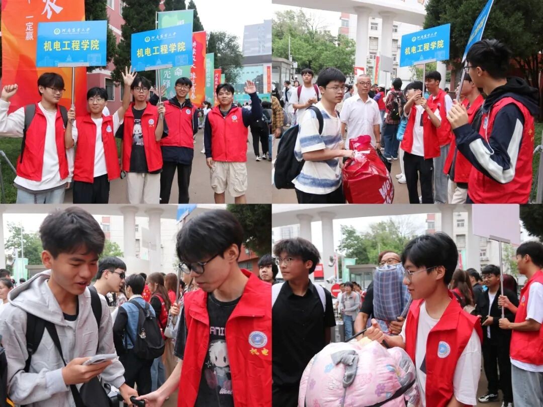 迎新当天清晨,校园已充满活力。辅导员、助班与志愿者早早到岗,报到点“机电迎新”主题展板醒目,引导牌整齐排列。志愿者分组行动:或在学校门口、公交站点迎接新生,主动接过行李箱;或在报到现场协助核验信息、领取校园卡;或全程陪同新生前往宿舍,沿途介绍教学楼、食堂等场所,用热情化解新生的陌生感。