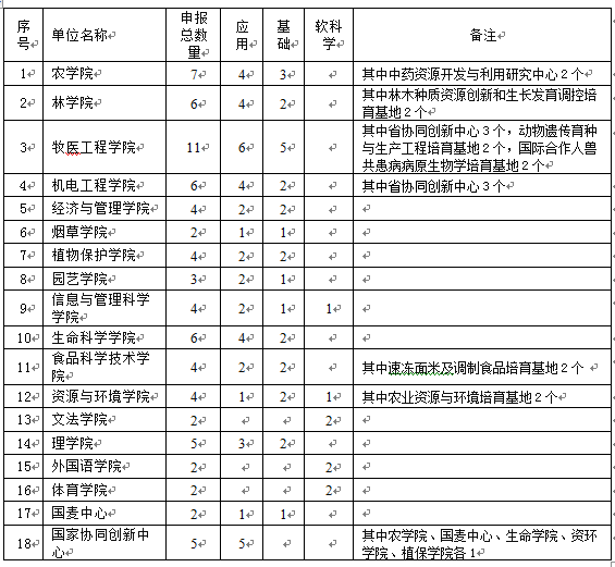 为保证项目质量和效益,计划类别实行限额申报,我校共计申报名额79个,其中基础研究28项,应用研究43项,软科学8项。依据各学院人才队伍规模和历年承担项目情况,所有申报名额分配至各学院,见下表