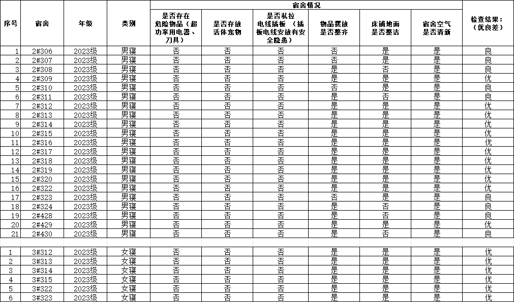 学院研究生会生活部对23级宿舍卫生安全检查情况公示如下: