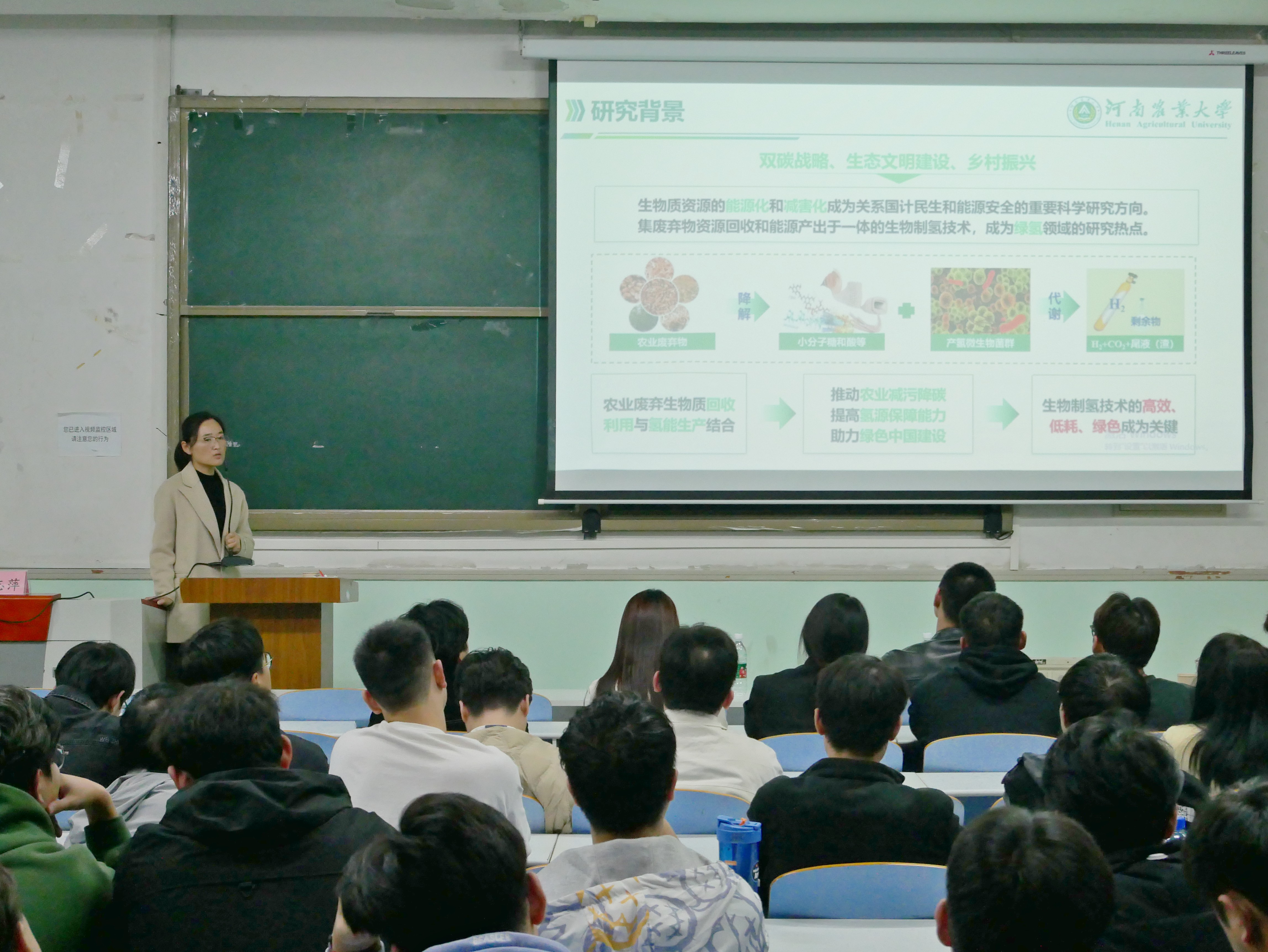 张志萍以“路虽远,行则将至”为主题,围绕自身经历、团队情况、科研经验等方面展开报告。张志萍分享了她在硕士和博士期间的学习经历,强调了要一心一意,不要三心二意,大把时间搞科研,告诫我们在工作和生活中要有所取舍。她在介绍自己团队情况时着重介绍了自己的导师,劝解我们应知恩图报,以实际行动回馈导师的教导,同时对对生物制氢的相关技术手段,实现方法进行介绍,她要求同学们应做到览前贤、知责任、念亲情、感师恩;长知识、增才干、培智慧、修品格。