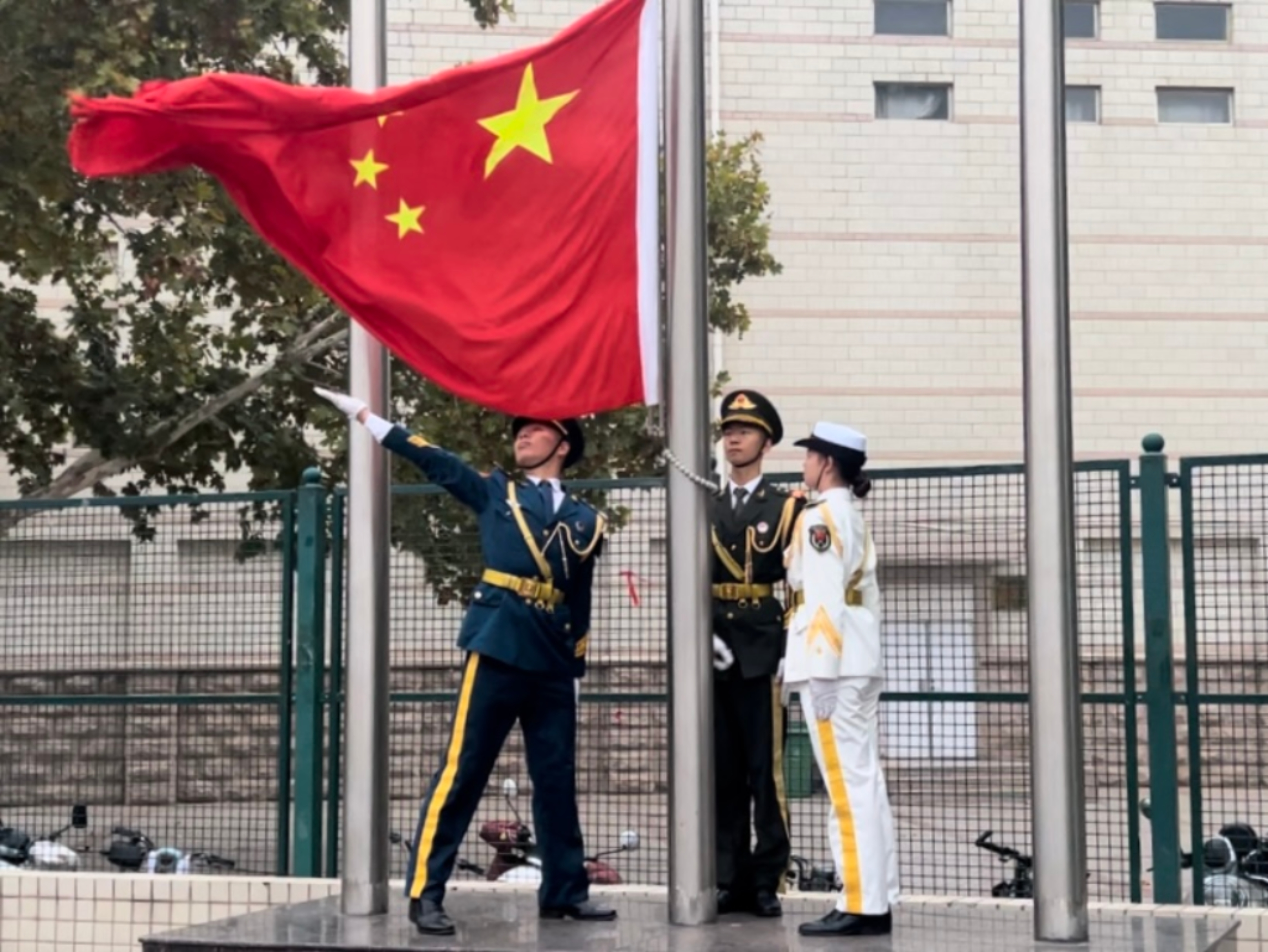 在雄壮的《义勇军进行曲》中,国旗护卫队迈着矫健的步伐,神情庄严地将国旗护送至升旗台。伴随着国歌的旋律,五星红旗冉冉升起,迎风飘扬,全体师生庄严肃立,向国旗行注目礼。