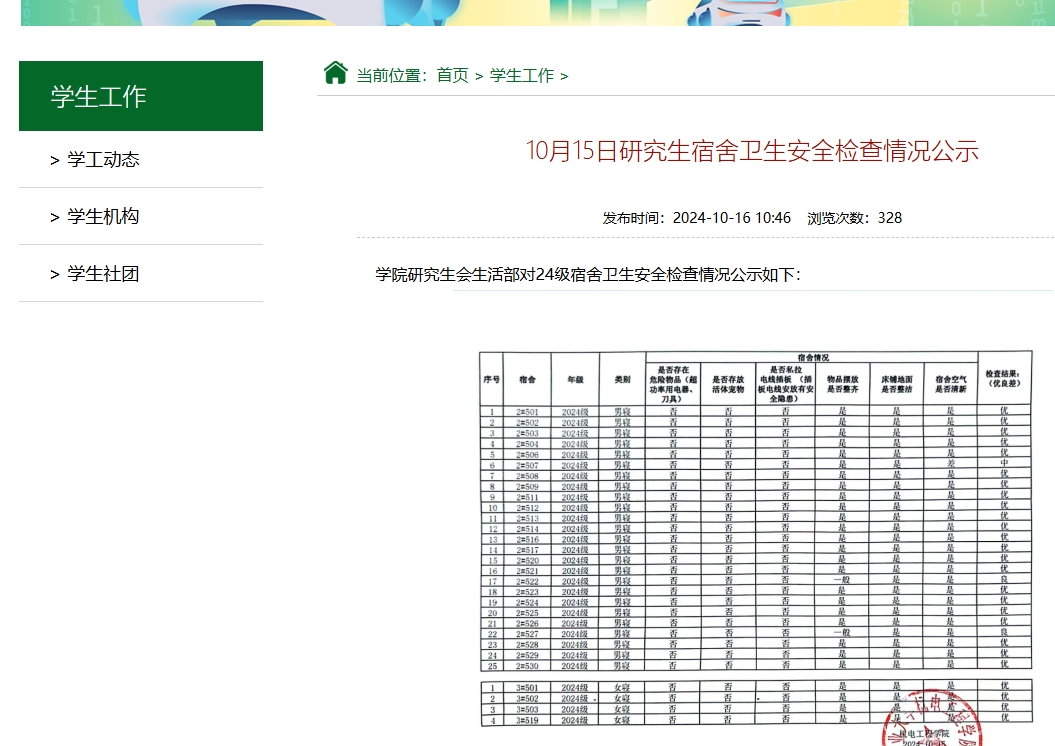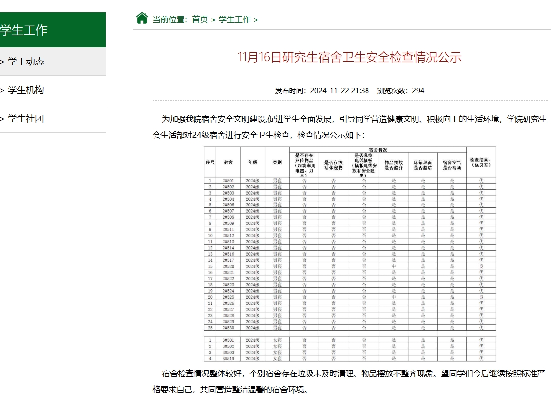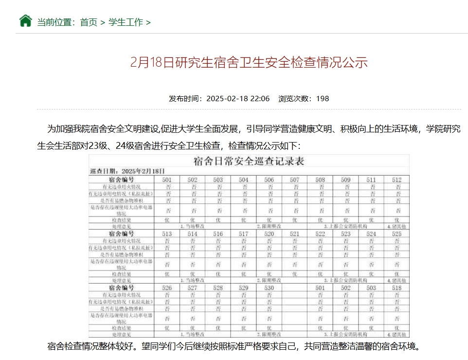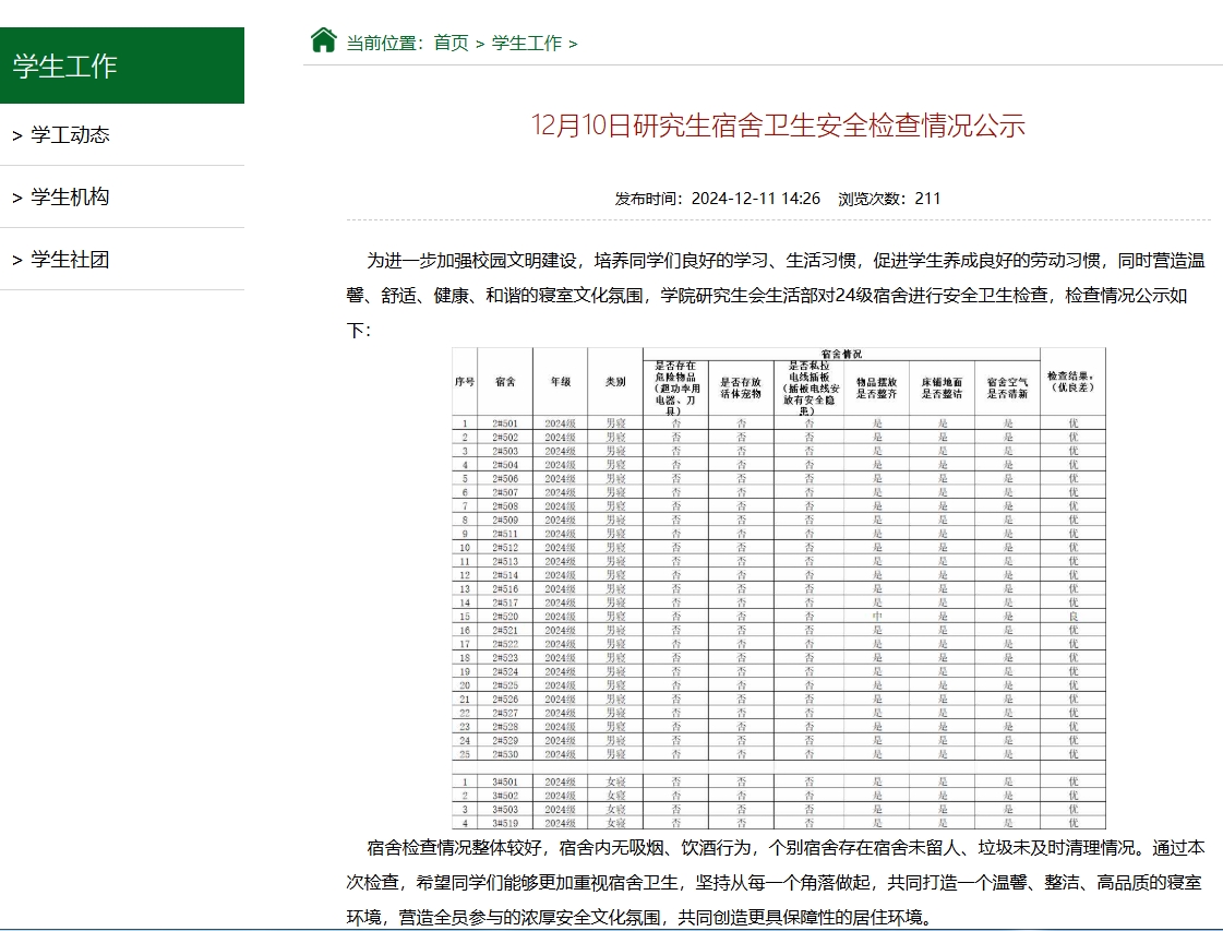 ◆对研究生宿舍安全卫生进行定期检查和不定期抽查