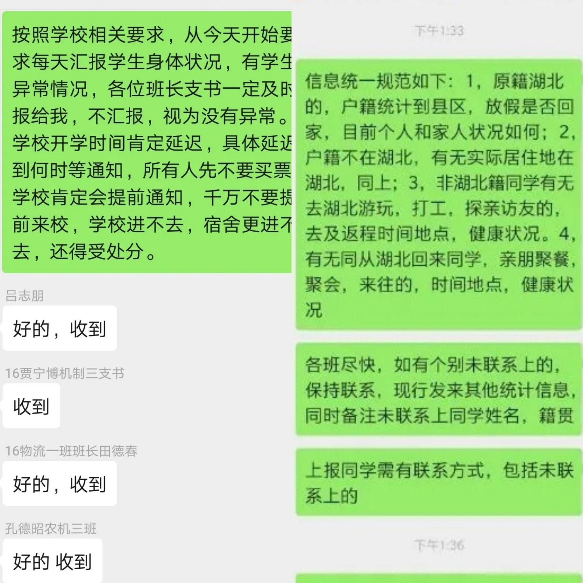 院党委书记李世欣、院党委副书记刘海涛多次通过学习强国视频会议,向辅导员们传达学校及学院工作部署与安排,要求高度重视疫情发展,准确把握每位同学身体状况,及时报送相关数据等诸多工作。为准确摸排了解每位学生的身体状况、出行情况和思想动态,色情小说网