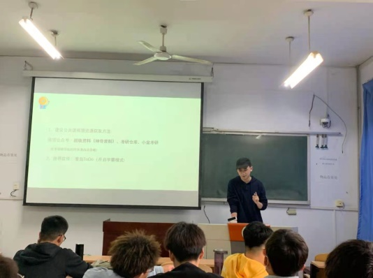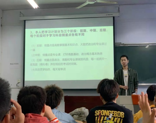然后王凯业同学分享了英语和政治两大公共课的复习方法。他首先带领同学们分析了这两大科目的题型,然后以大三结束的暑假为分界分析了在此前后的不同复习方法,这番宝贵的复习经验让同学们对考研复习过程有了更细致的认识。最后他指出,抵抗遗忘的最好办法就是重复,次数越多理解越深刻,记忆越牢固!同时还表示,考研复习时不怕忘,就怕断,因此勉励同学们如果选择了考研这条路,一定要持续学习坚持到底。