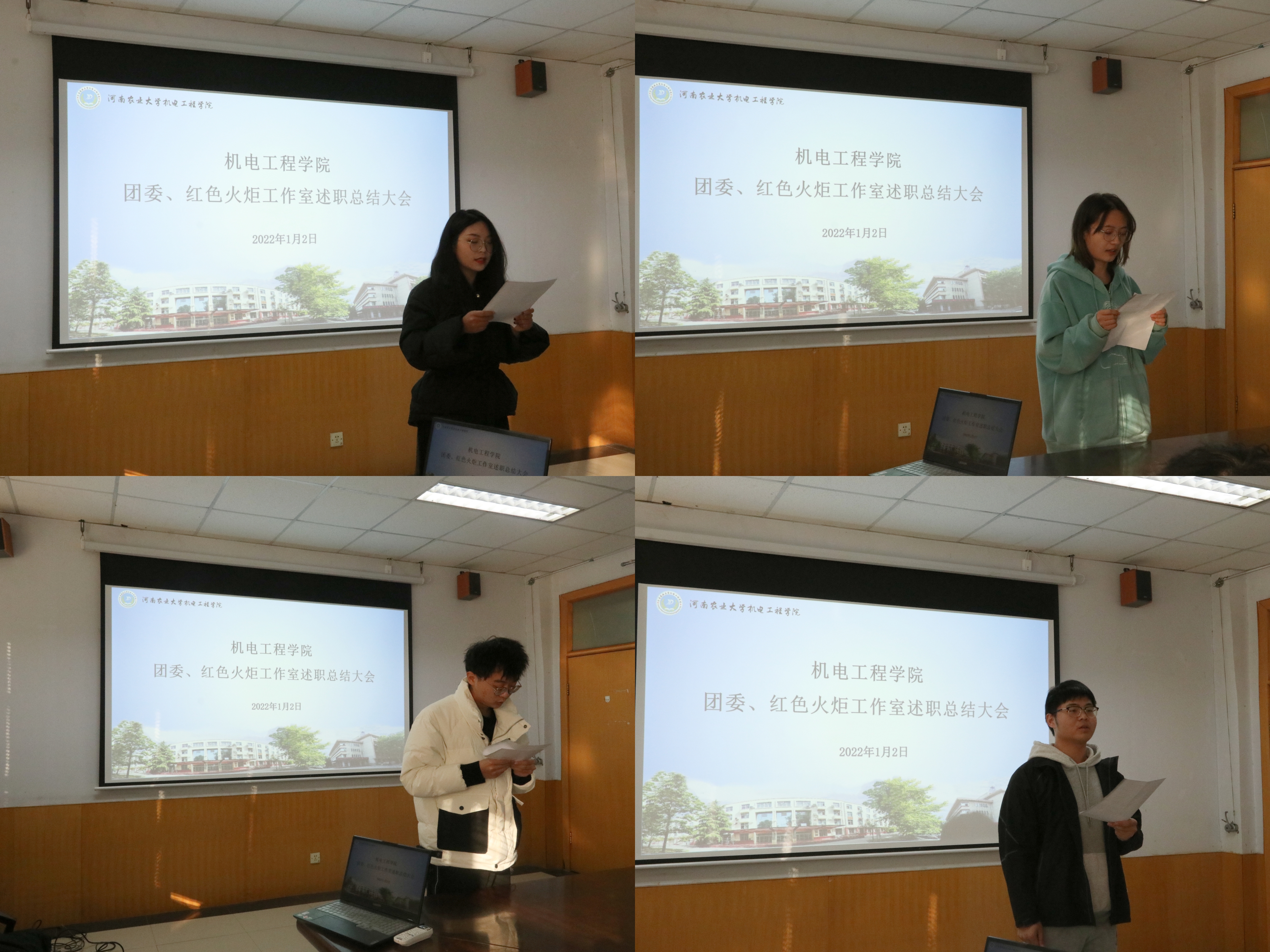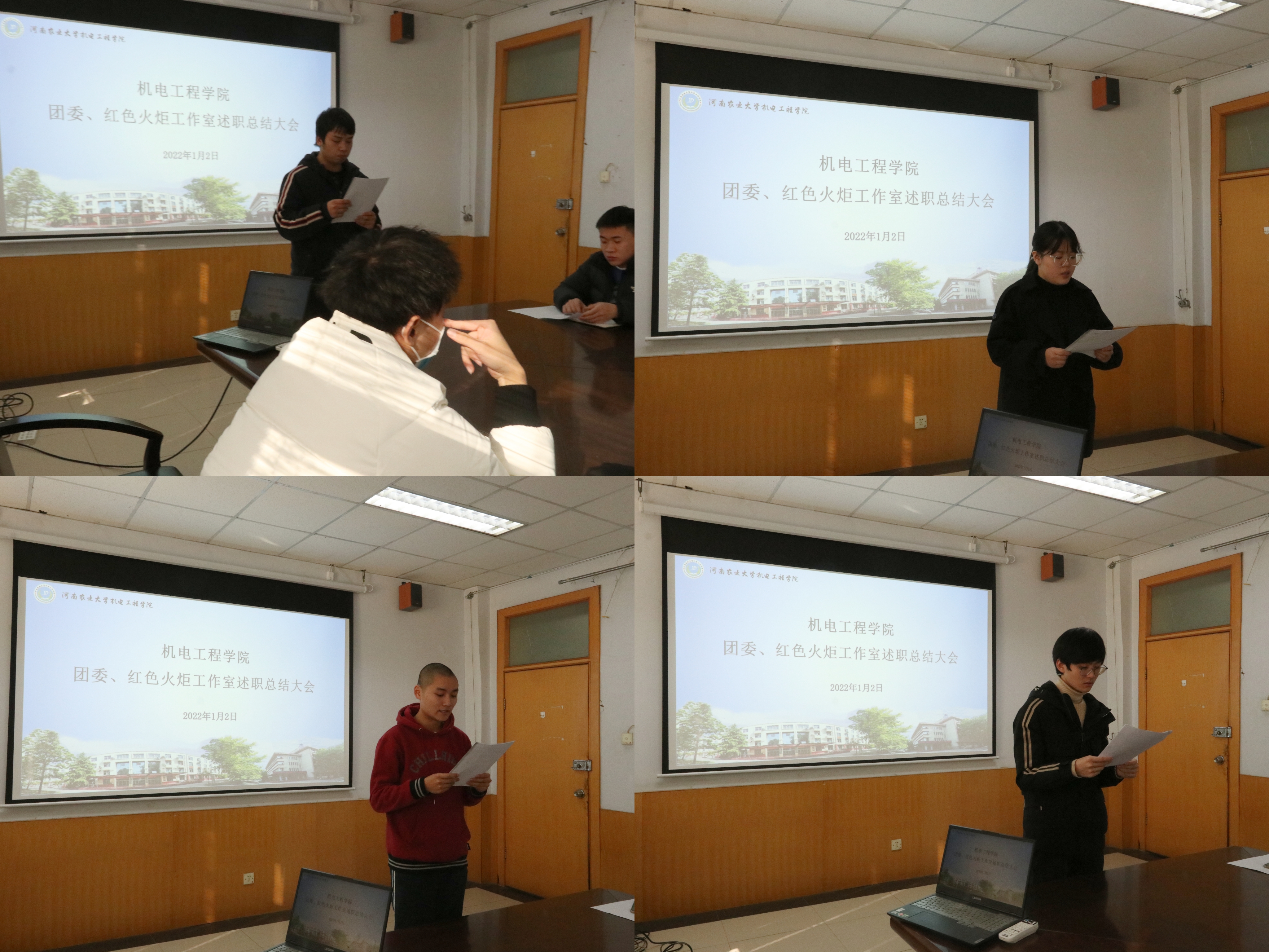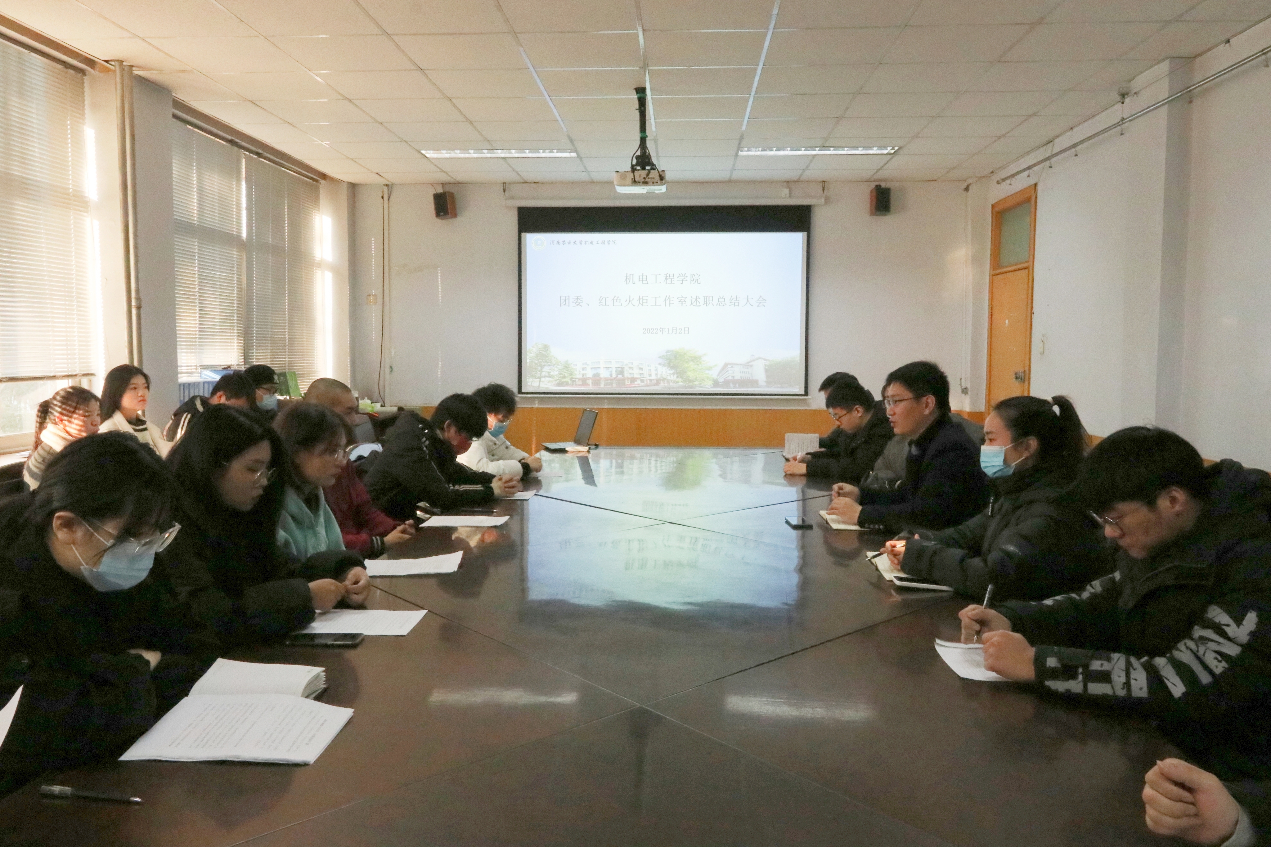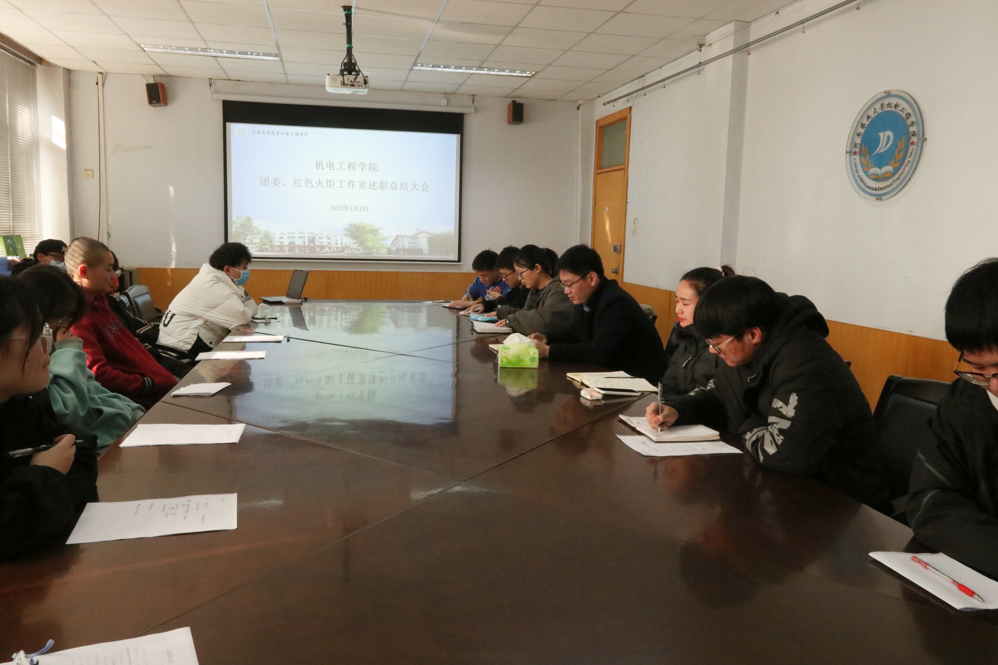 于文化路校区15号楼会议室顺利召开团委、红色火炬工作室述职总结大会,院团委书记黄笑,团委副书记徐捧丽,年级辅导员王晓楠出席本次会议,2021届院团委、红色火炬工作室成员参加会议。