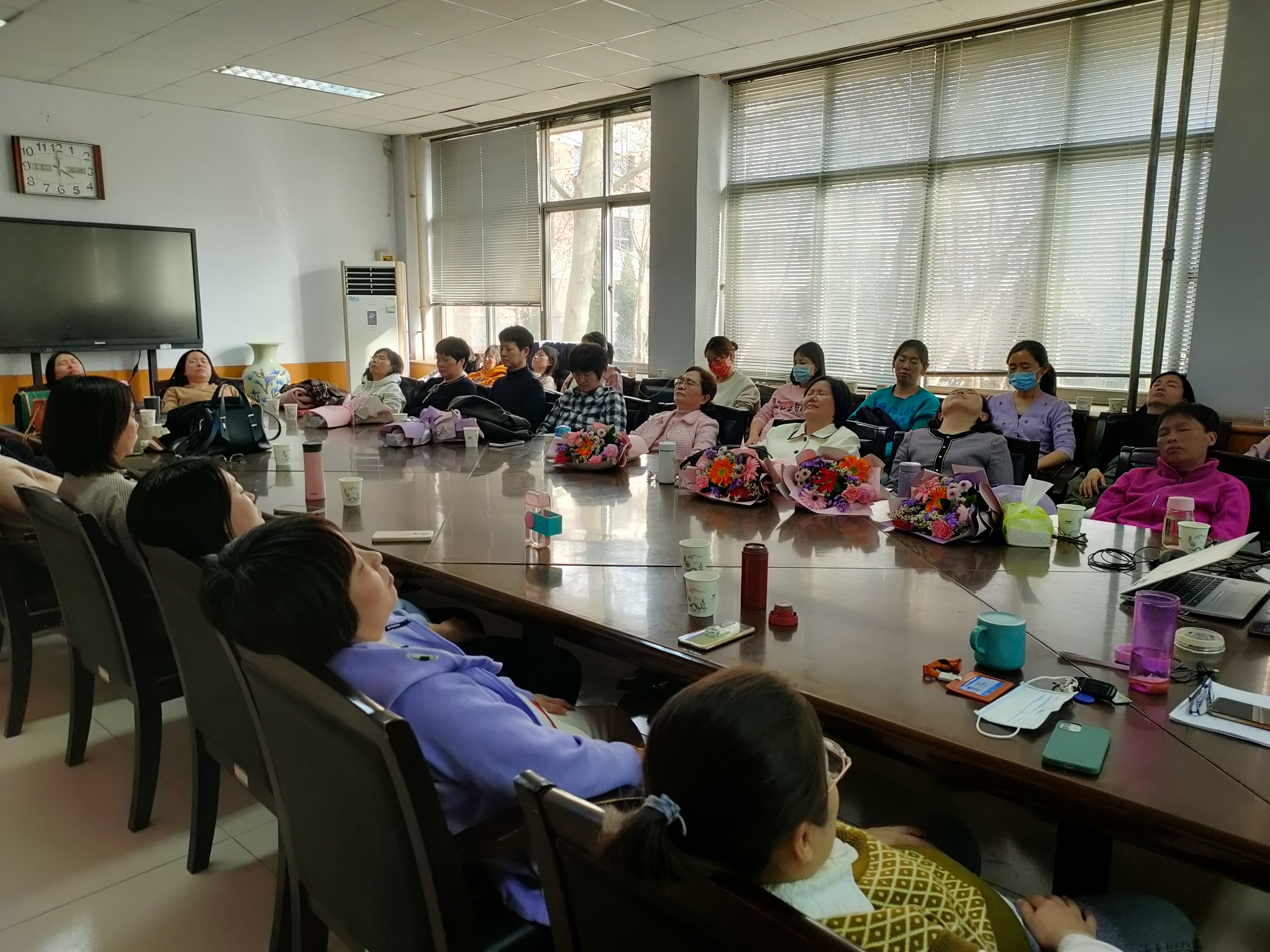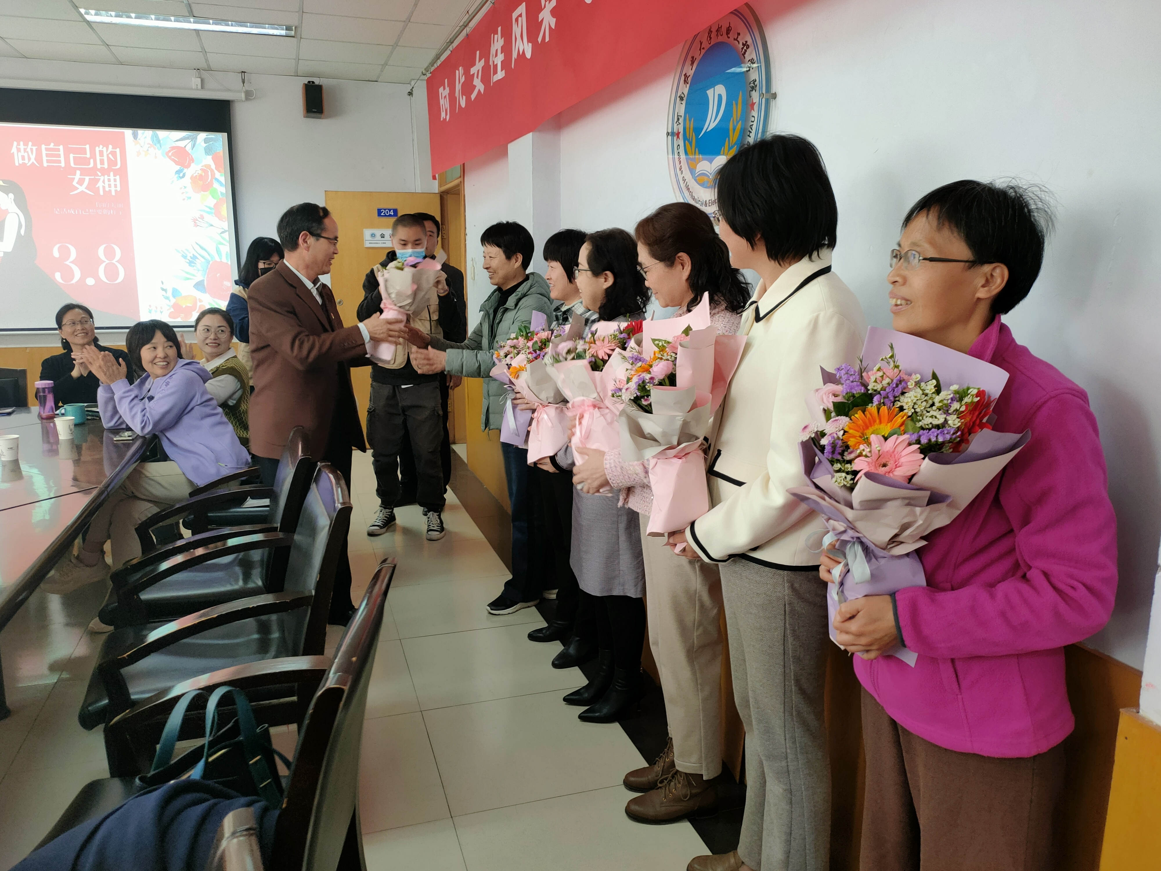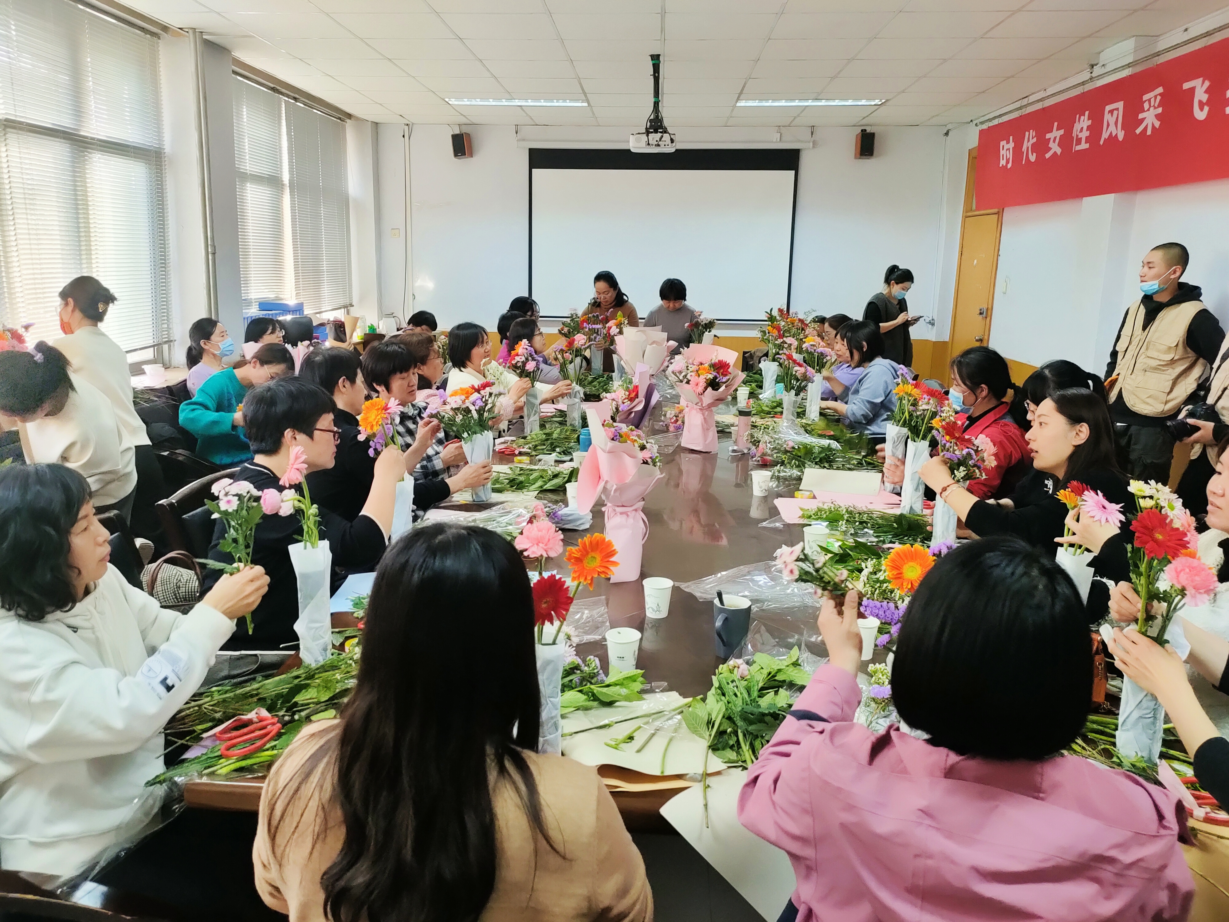 党委书记李世欣为奉献在教师、科研一线的女教师代表献花,向她们致以最诚挚的祝福,衷心祝愿女教职工们节日快乐、健康平安、青春永驻!副院长、国家二级心理咨询师、催眠师刘淑杰现场开展“做自己的女神”主题讲座,讲述情绪管理的含义及三个层次、情绪处理的常用方法,通过正念冥想等控制情绪,最后各位老师体验催眠放松方式。随后插花活动正式开始,洋牡丹、康乃馨、勿忘我、非洲菊、澳洲腊梅等一朵朵漂亮的花经过老师们悉心修剪、细心搭配造型,形成错落有致、创意十足的插花作品,令人赏心悦目。