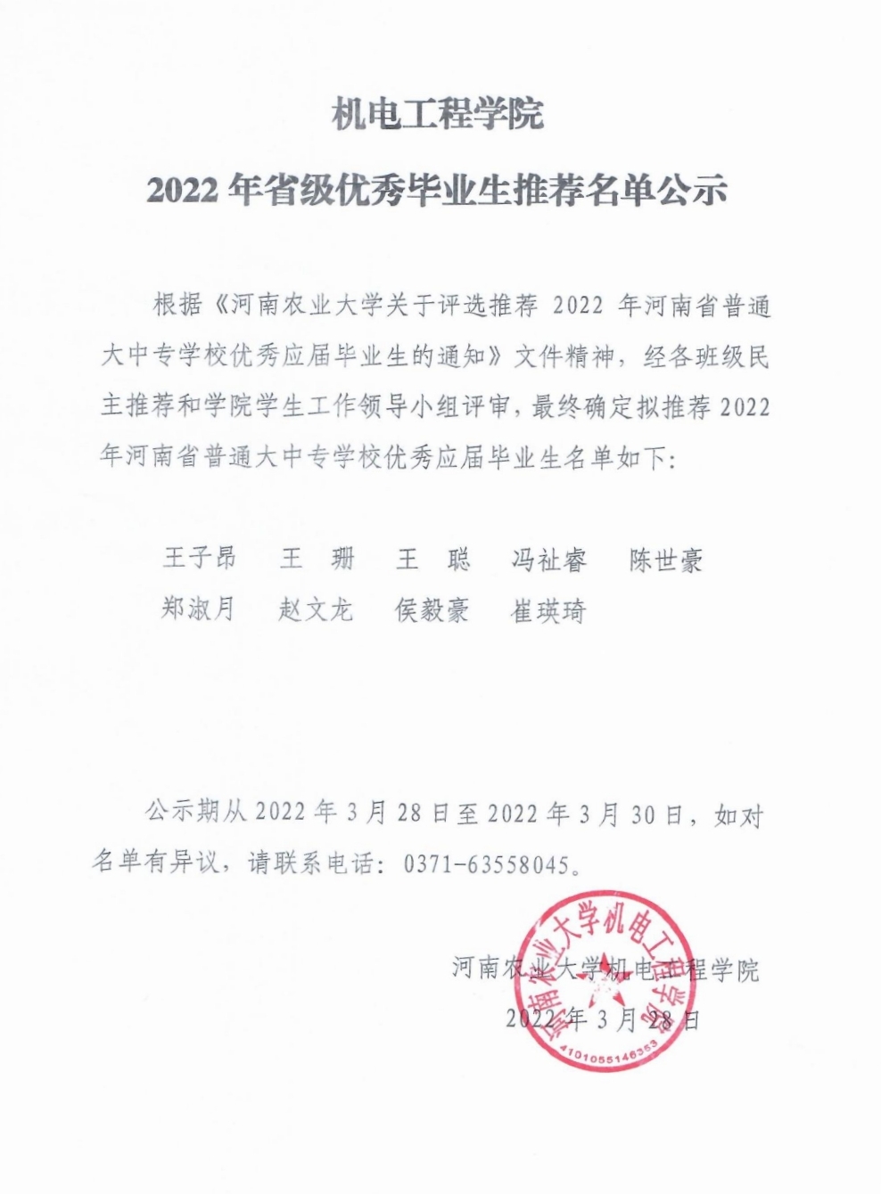 根据《色情小说网 关于评选推荐2022年河南省普通大中专学校优秀应届毕业生的通知》文件精神,经各班级民主推荐和学院学生工作领导小组评审,最终确定拟推荐2022年河南省普通大中专学校优秀应届毕业生名单如下: