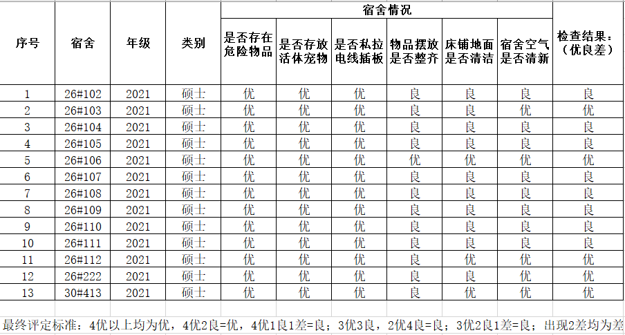 3月29日宿舍安全卫生检查结果