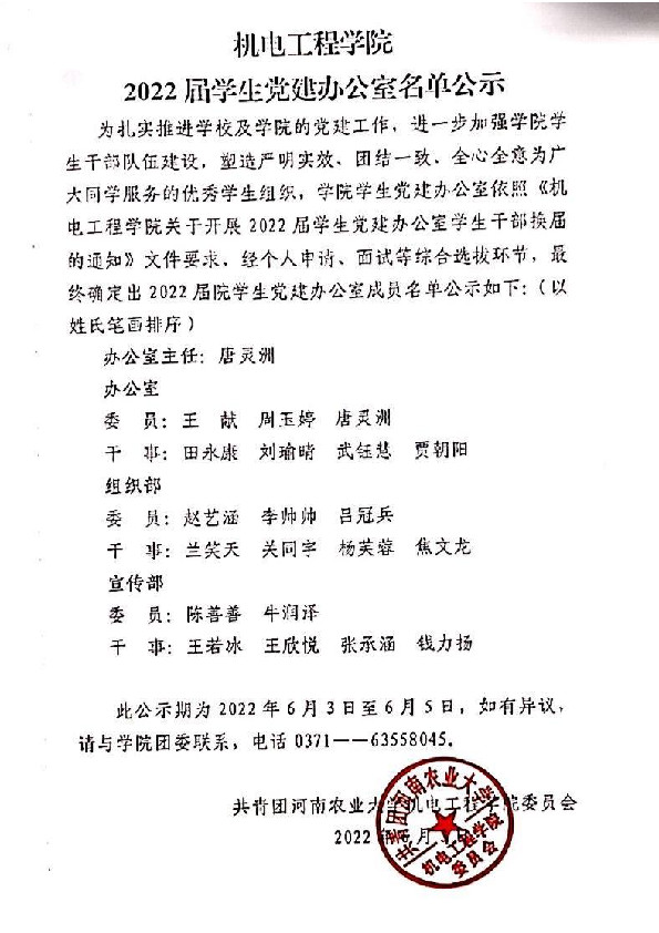 为扎实推进学校及学院的党建工作,进一步加强学院学生干部队伍建设,塑造严明实效、团结一致、全心全意为广大同学服务的优秀学生组织,学院学生党建办公室依照《色情小说网 关于开展2022届学生党建办公室学生干部换届的通知》文件要求,经个人申请、面试等综合选拔环节,最终确定出2022届院学生党建办公室成员名单公示如下:(以姓氏笔画排序)