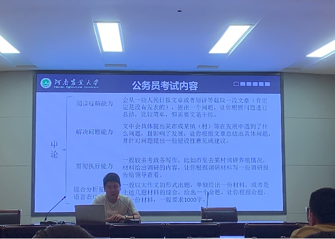 优秀就业硕士毕业生代表吴亚文就公务员种类、公务员考试内容和如何备考三个方面详细介绍了如何备考公务员,面面俱到,犹如醍醐灌顶,让大家对公务员国考、省考及选调生考试有了清晰的认识,也明白了该如何着手准备。王晨分享了自己的择业就业经历,建议同学们首先要明确择业方向,即理想的工作性质和工作地点,进一步再去确定公司。然后给大家传授了投简历和面试的经验技巧,告诉大家如何顺利应对面试官的提问。