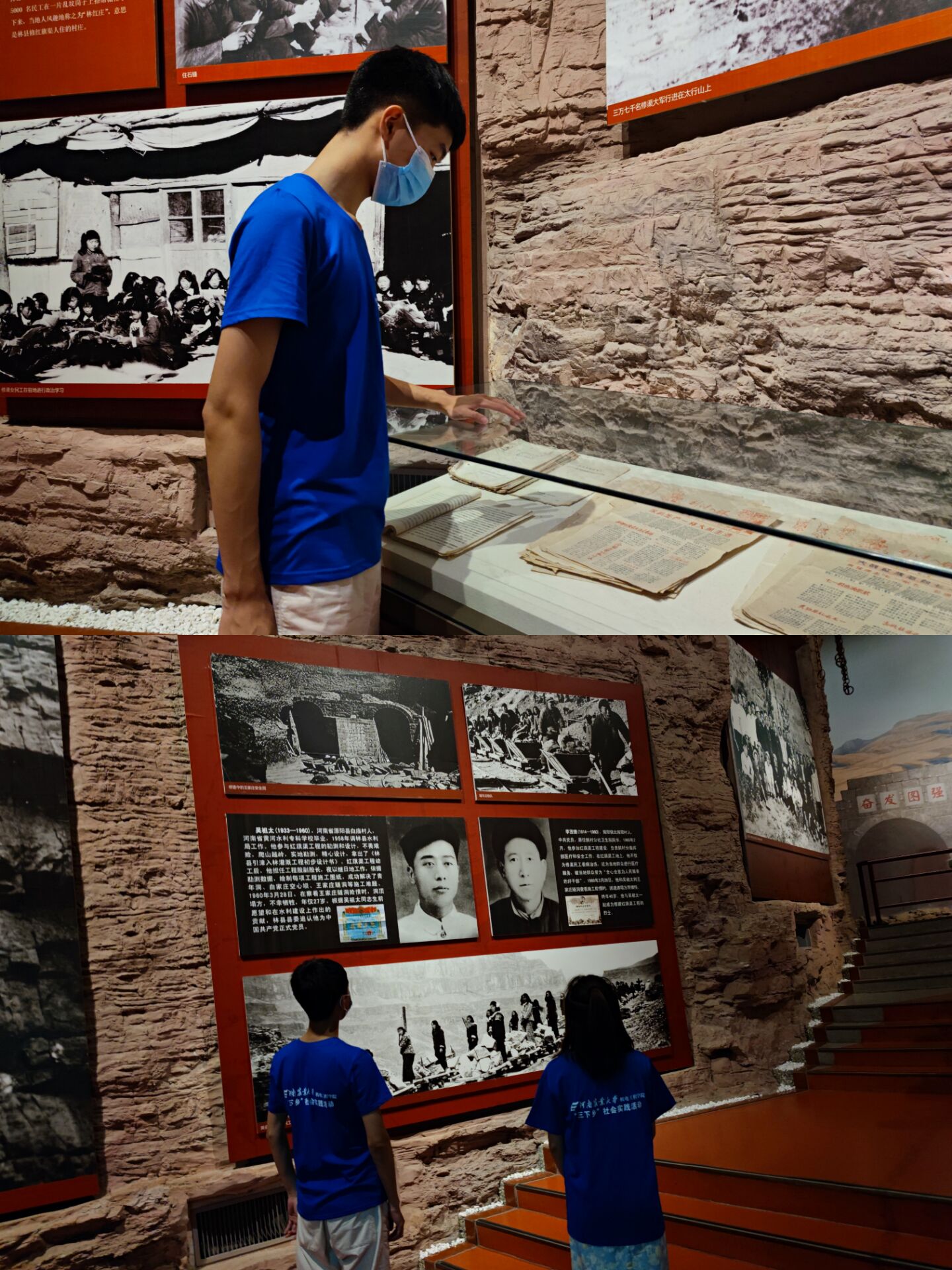 随后,实践队员们来到“引漳入林动员令”展示区,通过参观区内陈列的珍贵历史图片与劳动工具,他们仿佛看到了六十年前人们正在修建这条“人工天河”时的情景,深刻体会到林州人民与干旱抗争到底的决心,被他们身上所展现的“自力更生、艰苦创业、团结协作、无私奉献”的红旗渠精神所深深打动。