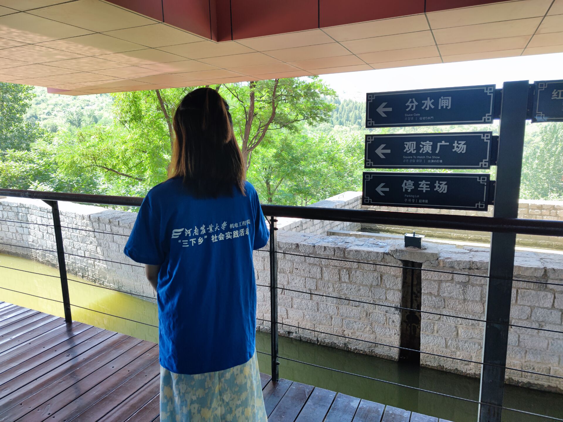 离开纪念馆,实践队员们来到了红旗渠分水闸,通过与当地居民进行交流,队员们了解到此处是红旗渠分水的大闸门,更是红旗渠总干渠分水的重要枢纽。站在分水闸的正前方,队员们清晰地看到纪念馆楼顶高悬着郭沫若手迹“红旗渠”三个苍劲有力的朱红大字,看到它们就仿佛感受到了面对极其严峻的干旱条件下林州儿女身上存有的那份铮铮铁骨和在修渠过程中凝聚而成的红旗渠精神。