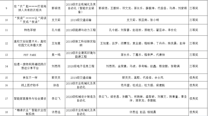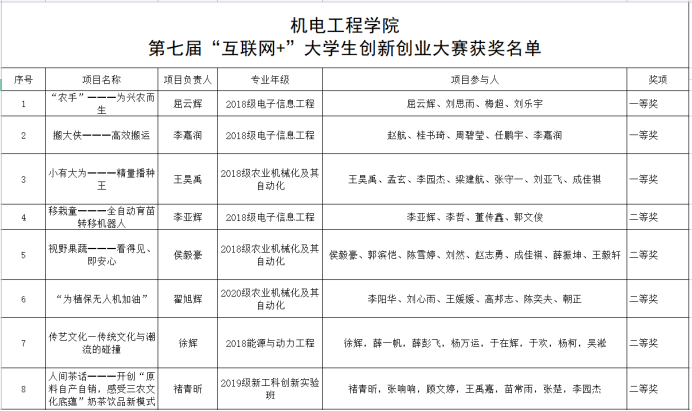 广泛动员,积极组织开展了第七届“互联网+”大学生创新创业大赛,最终评选出一等奖3名,二等奖5名,三等奖6名,优秀奖4名。现将获奖名单公示如下: