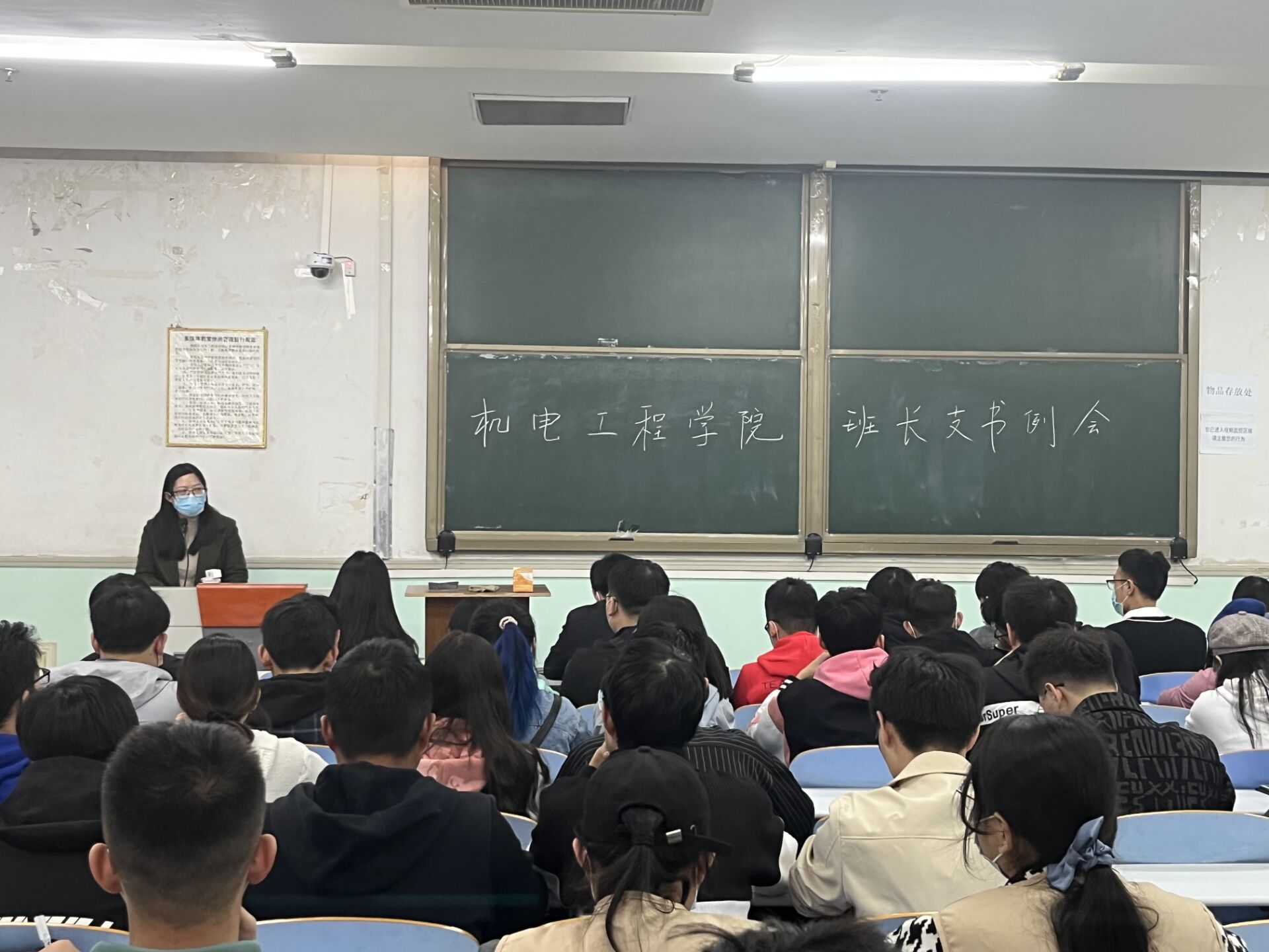 于文化路校区工程楼302教室召开新学期全体班长支书例会,院团委书记黄笑、团委副书记徐捧丽、辅导员胡亭亭出席本次会议,全体班长支书以及各新生助班参加会议。