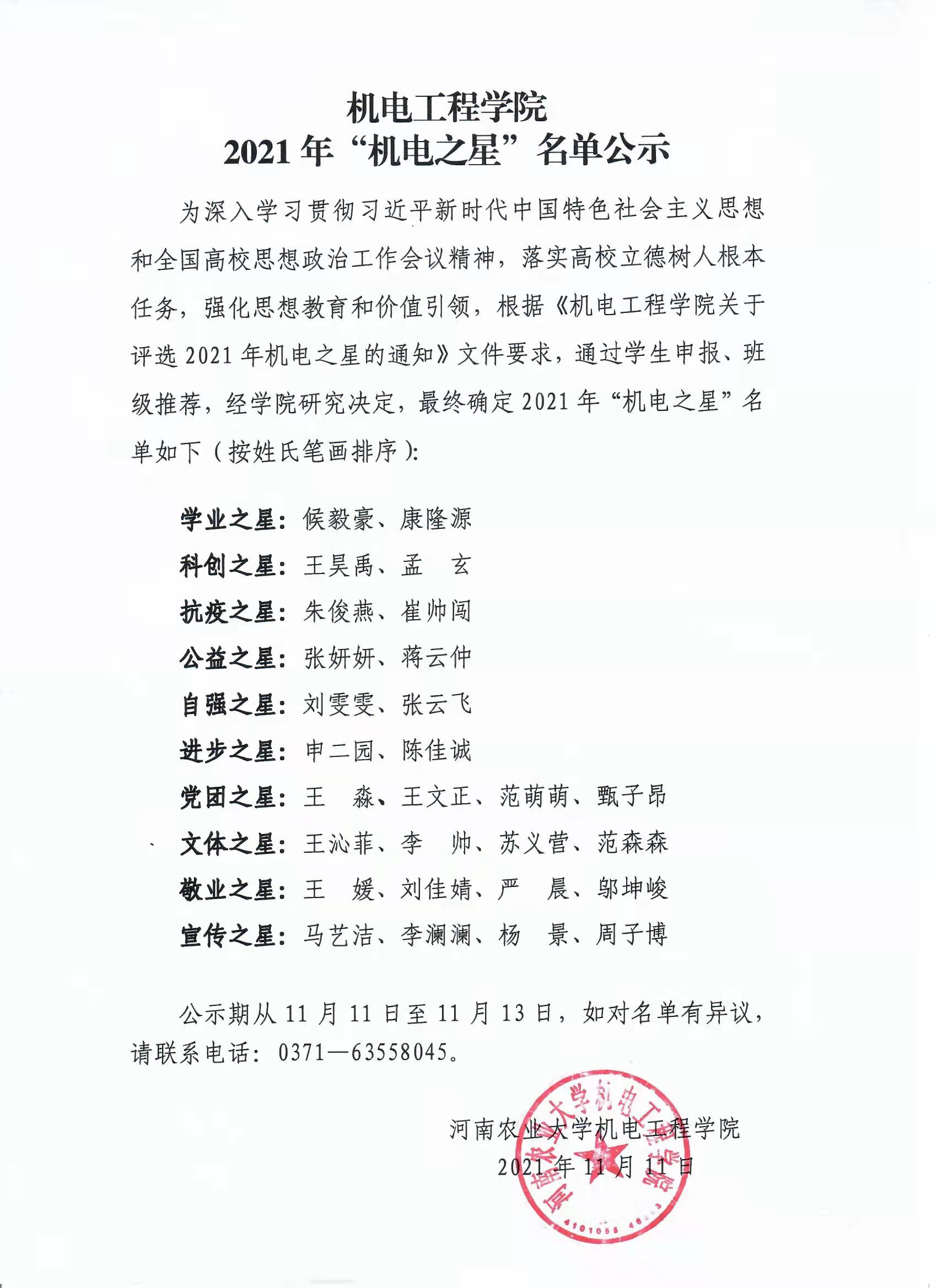 为深入学习贯彻习近平新时代中国特色社会主义思想和全国高校思想政治工作会议精神,落实高校立德树人根本任务,强化思想教育和价值引领,根据《色情小说网 关于评选2021年机电之星的通知》文件要求,通过学生申报、班级推荐,经学院研究决定,最终确定2021年“机电之星”名单如下(按姓氏笔画排序):