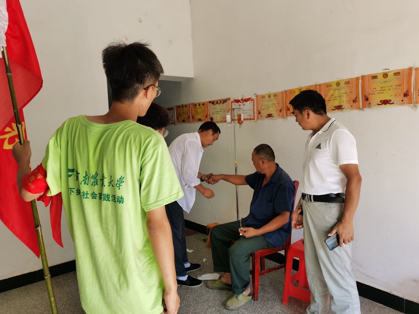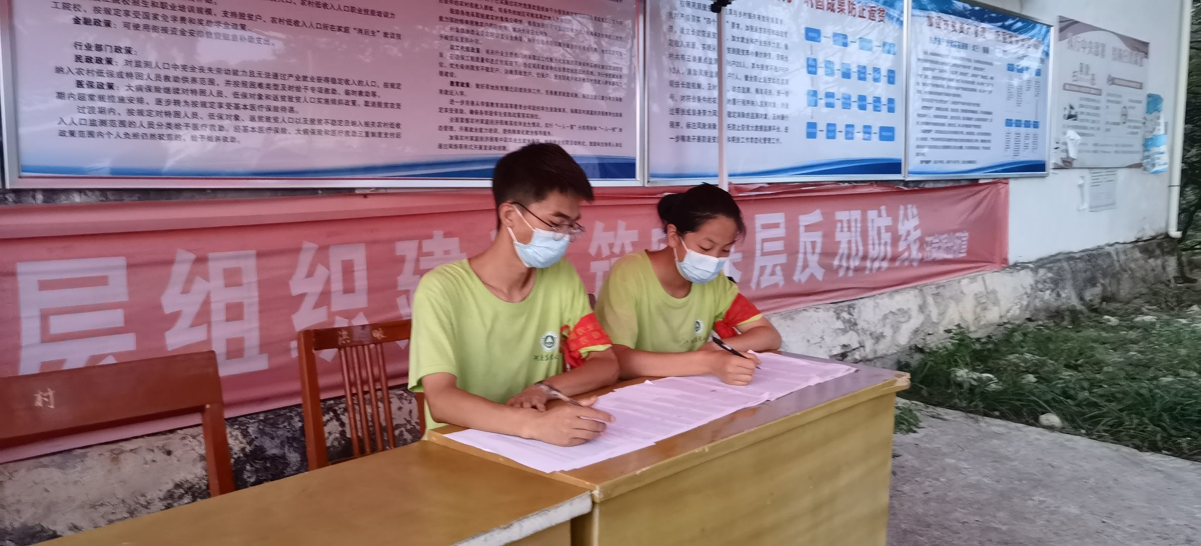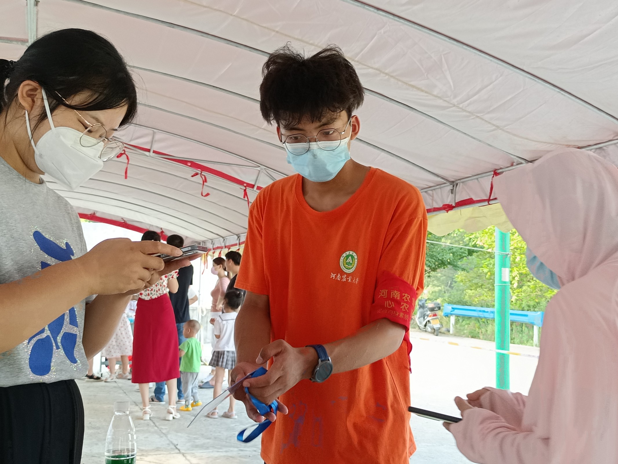 7月15日,实践队员们积极响应疫情防控号召,协助当地政府开展核酸检测。队员们分工明确,一部分负责为村中没有智能机的老人打印纸质核酸申请码,一部分对前来的村民悉心引导、维持秩序,耐心讲解核酸码的使用方法。口罩遮不住的是队员们坚定的双眼,酷暑挡不住的是队员们坚毅的决心,面对挑战,初心同梦洪畈队勇往直前,展现着当代大学生敢作为、能作为的卓越风采。