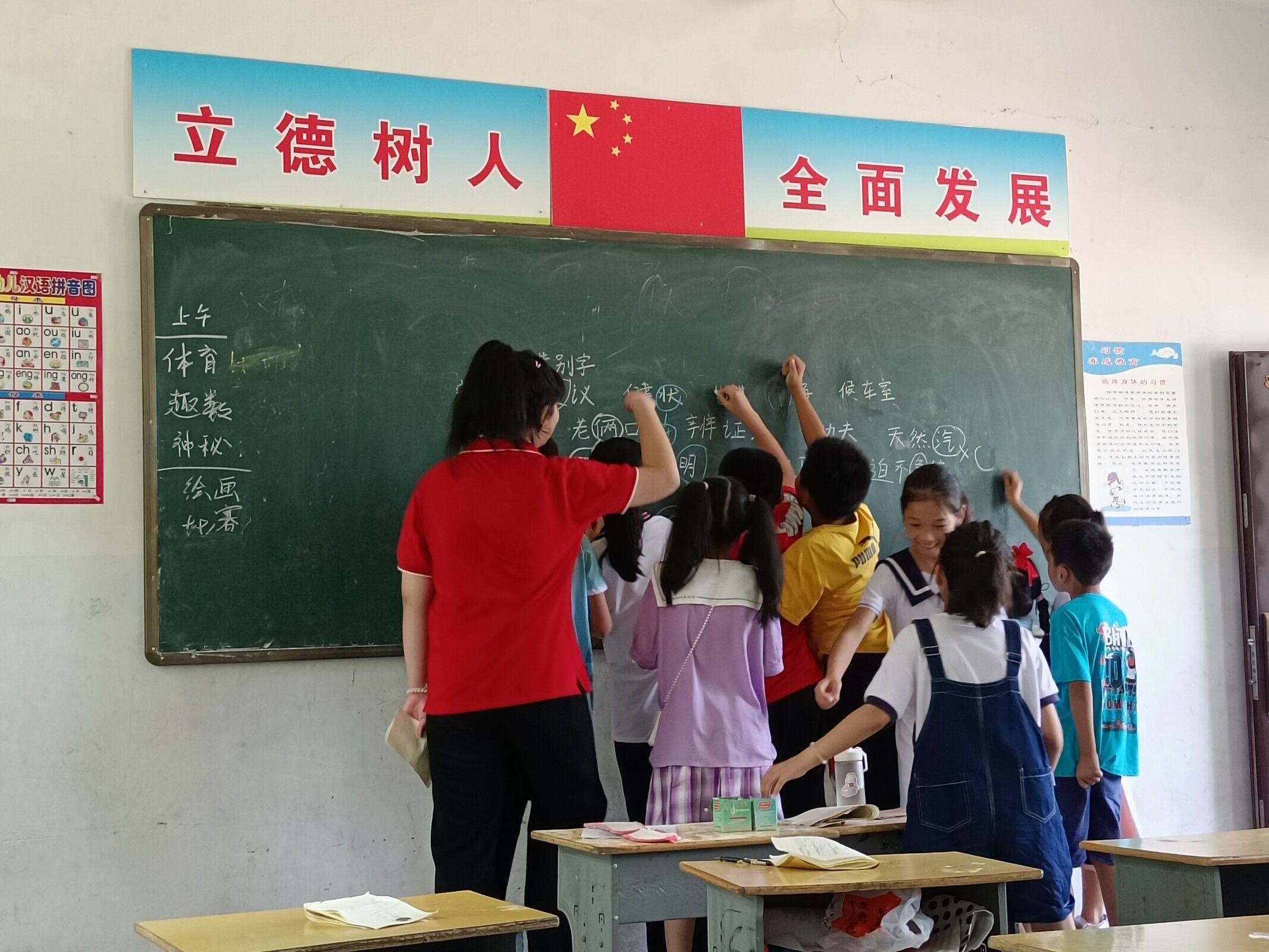 7月18日,在当地村委的帮助下,实践队员们带领孩子们举行了升国旗仪式,孩子们对着国旗宣誓,热情四溢。当天下午,支教组开展绘画展示活动,鼓励孩子们大胆思考与想象,致力于培养学生审美文化素质,提高审美能力。